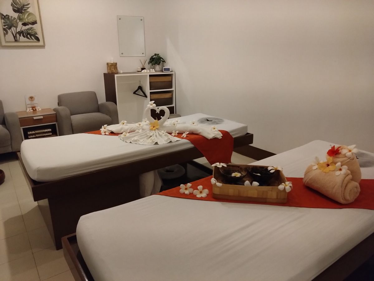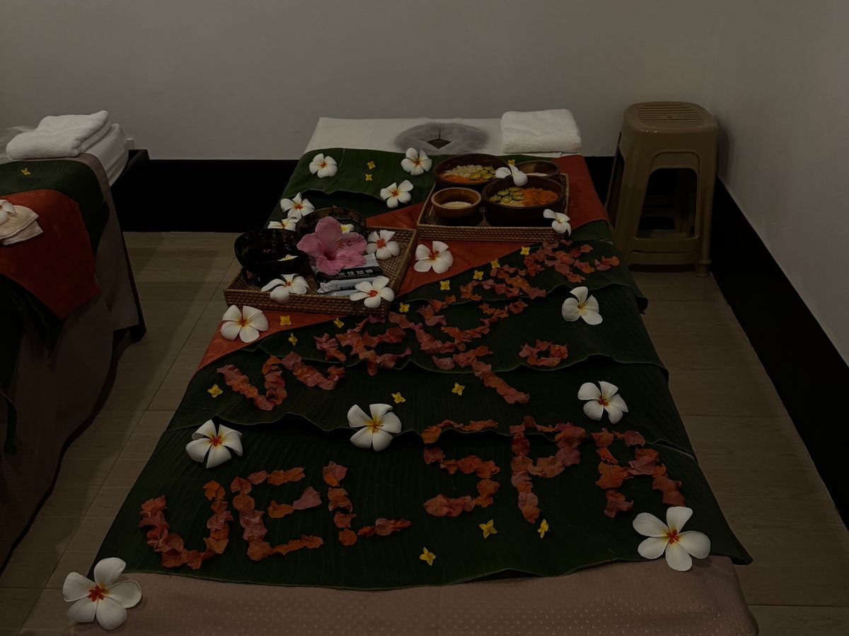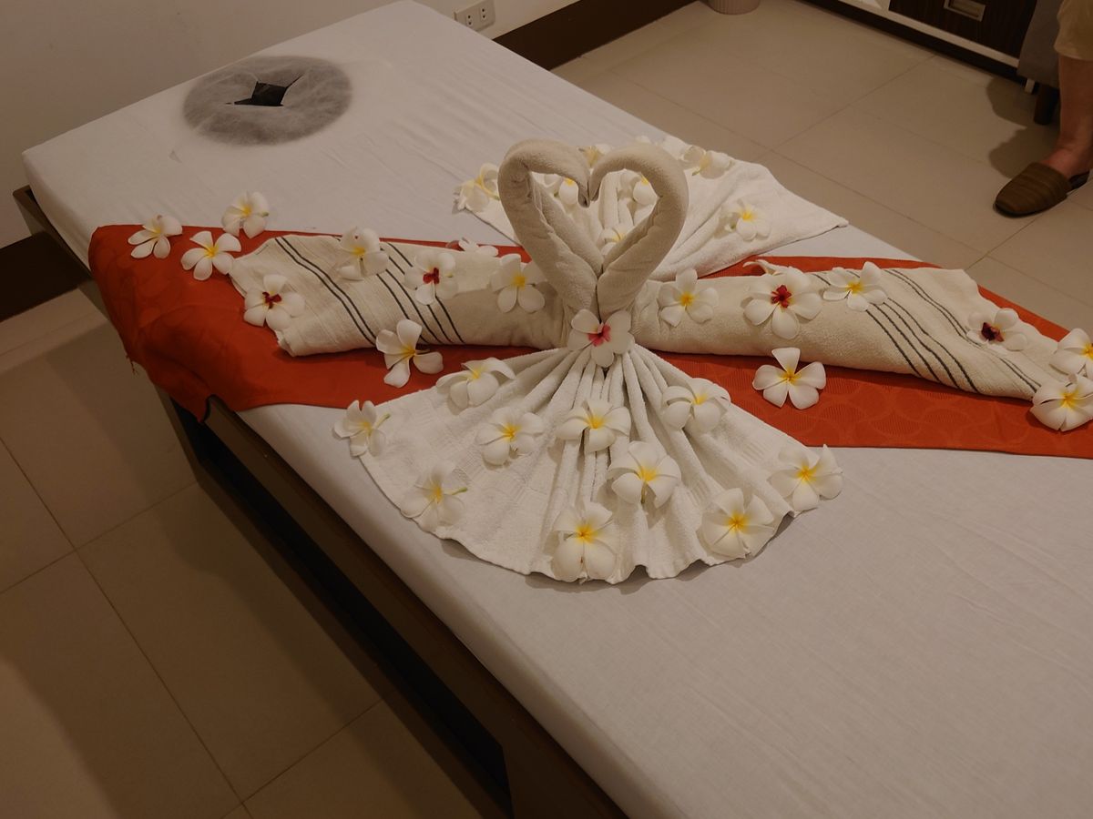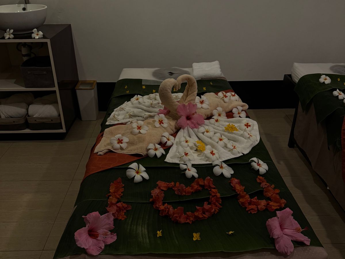 深夜1時発の便でしたが、ホテルが16時まで使えたのでそれまではホテルでまったり過ごして、17時に迎えに来ていただきました。受付の聞きなれた日本語の説明にホッとしつつ、施術へ。メニューの変更にも快く応じて頂きました。施術室には写真のようなデコレーションがあり、新婚旅行でもないので照れ臭くもありましたが、おもてなしの心がうれしかったです。