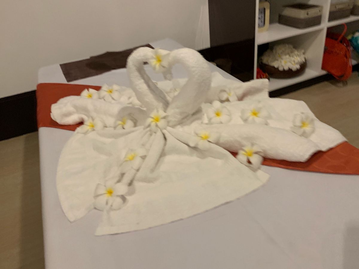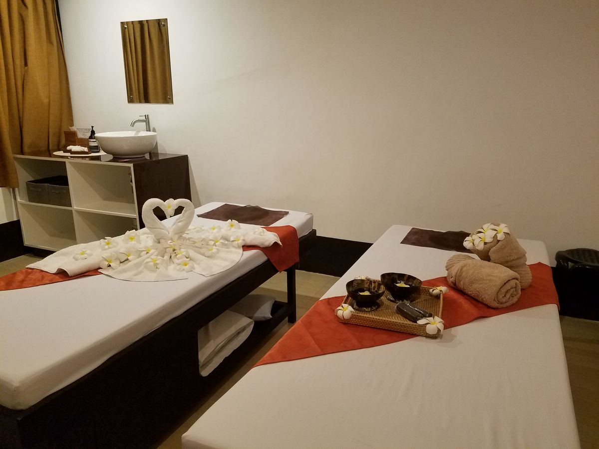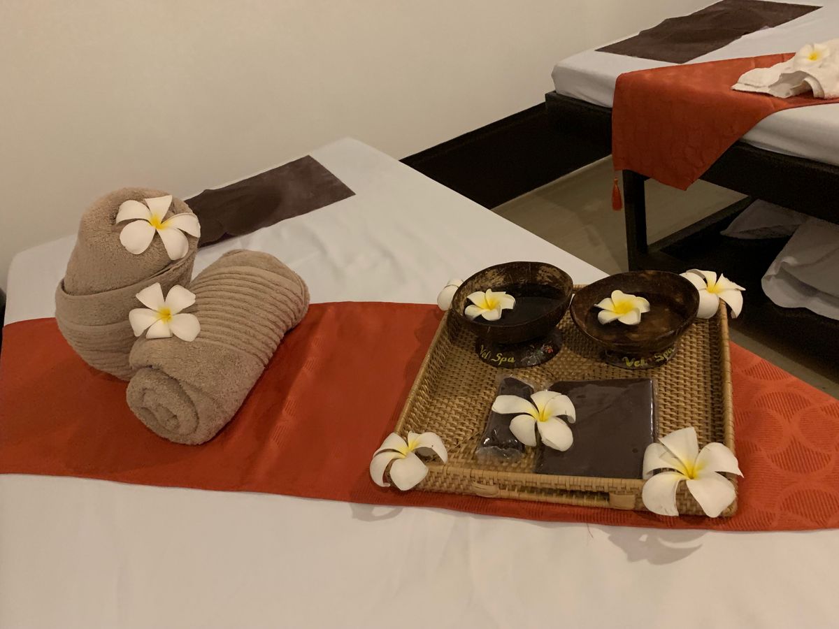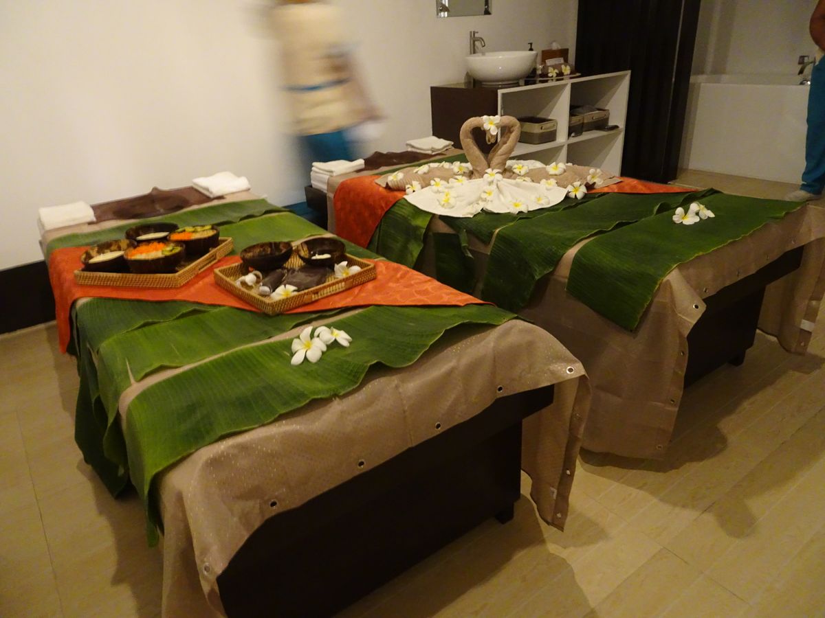 180分のコースには、フット角質ケア、ボディスクラブ、バナナの葉っぱでのボディラップ、ヘッドマッサージ、ボディマッサージ、フェイシャルが含まれてました。フット角質ケアは足裏真ん中から指の裏あたりばかりで、かかとは殆ど触ってなかったです。全体をゆるい感じでケアされる感じでした。ヘッドマッサージは主にラップをしてる時にしてくれましたが、ボディマッサージの時も少しヘッドもマッサージしてくれました。強いマッサージに慣れてる私には物足りなかったので、もっと強くマッサージしてくれるようお願いしました。時々強さ加減は大丈夫かと確認しながら施術してくれました。ボディラップが終わると、シャワーで髪と体を洗い、ボディマッサージに入りました。時折タイマッサージみたいに少し体を伸ばしたりして気持ちよかったです。フェイシャルもフットケアと同じく、割とさらっと終わったような感じです。