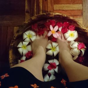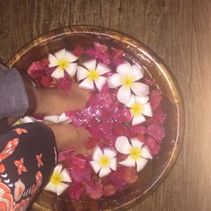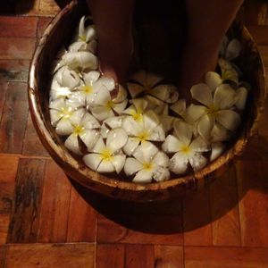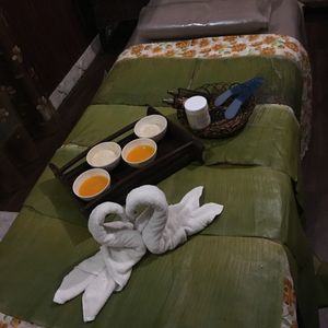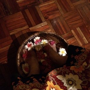 まず、足湯からはいり、かかとかの角質取って、全身スクラブ→パパイヤパック→バナナ葉っぱでラップ→シャワー→フラワーバスに浸かりながら、パパイヤとお茶を頂きその後、アロマオイルマッサージで、強さは選べます。その後ストレッチもして頂きました。フェイシャルもその間にて入りました。