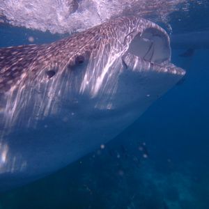 移動のボートに乗りほんの少し沖へ移動、ボートの上からジンベイが見えびっくり!シュノーケルマスクをつけ海の中へ!何匹ものジンベイが大接近で、大きな口や可愛い目を目の前で見れて触れないようにするのが大変な位でした。私は泳げないので不安でしたがガイドさんが常に近くで誘導してくれ大変助かりました。15分位水中で過ごしボートへあがりました。ちなみにここでは日焼け止め、サンオイルは禁止です。
