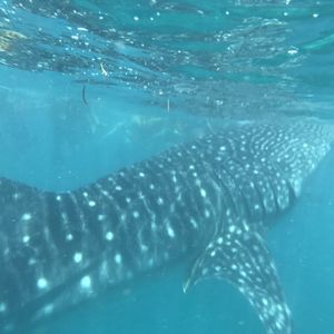 ボートが到着してから、ジンベイのポイントまで50m程、泳がなくてはなりません。深い海ですが、ガイドさんのフロートに掴まっていれば、安心です。「もう来ましたよ、見えていますよ!」ガイドさんの声で水の中を見回すと、遠ざかる尻尾が!テンション↑。少しすると、また「来ましたよ!」今度はバッチリ見ました。「ジンベイザメと一緒に泳ぐツアー」の看板に嘘偽りなしです。次々と、ジンベイザメが現れ(特に最後に来たのはデカかった!)本当にすぐ近くで見られる、夢のような時間でした。