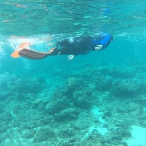 ジンベイザメとスノーケリングして、また違うところでスノーケリングをしました。魚に餌をあげながら、泳いだので魚がいっぱいよってきました。ガイドさんがどの魚がおいしいのか教えてくれました。