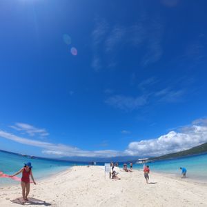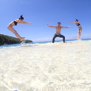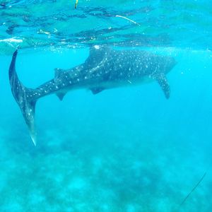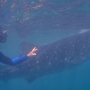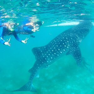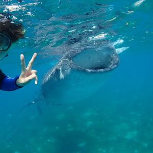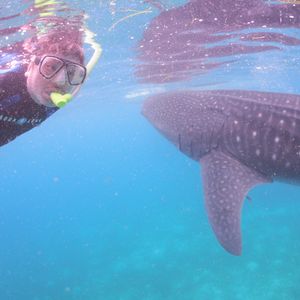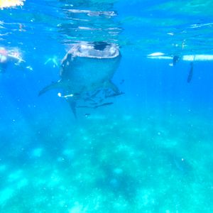 前日の雨により海水が濁ってしまったようで、ジンベイザメは近くに行かないと確認できないほどでした。しかしガイドさんが全力を尽くして写真を撮ってくださったり盛り上げてくださったのがとても印象的で、マイジンベイザメを捕まえてきてくれたり、写真のポーズを教えてくれたりして本当に楽しかったです!いい思い出になりました!