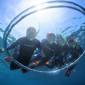 到着後ウェットスーツに着替えて船に乗り、シュノーケルの説明を受けて海へgo!