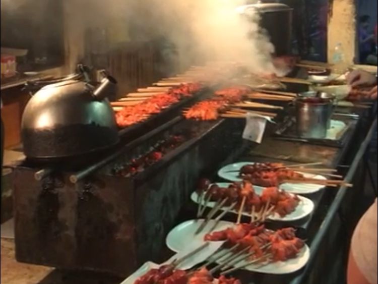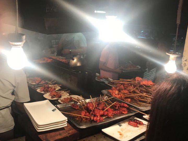 スタイルとしては焼いてほしい串をチョイスしてその場で焼いてもらってテーブルで食べるBBQスタイルです。行った時間が遅めだったのでメニューはチキンとポークの串しかありませんでした。ローカルに混ざってガイドさんドライバーさんと並んでいると、、前の若者達に声を掛けれました。