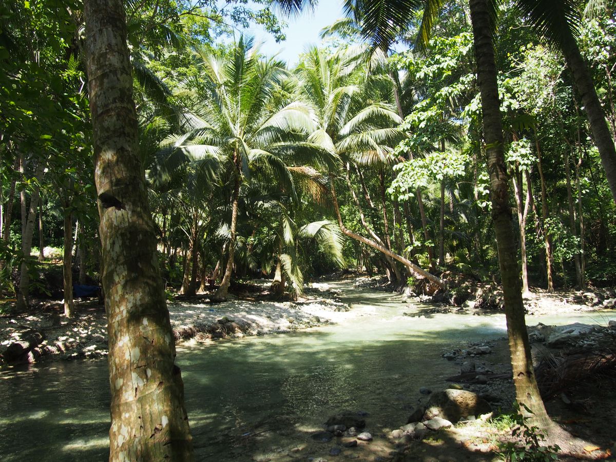 カワサンホールの入口に到着し、ここからは徒歩です。大きなヤシの木に囲まれ、川の横を歩き、橋を渡り、自然を満喫できます。地元の方はサンダルでしたが、靴を履いてきて正解でした。
