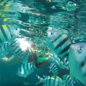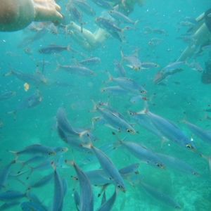 シュノーケリングをする際にガイドさんたちが魚の餌としてパンをくれるので、カラフルな魚たちがたくさん寄ってきてくれます。違う国で同じようなシュノーケリングツアーに参加したことがありますが、今までで一番魚が集まってきたように思います。