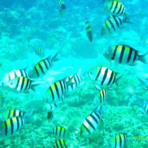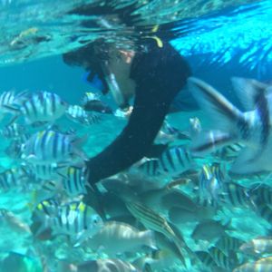 アイランドピクニックの情報を事前確認して参加しました。思っていたより海の輝きが綺麗で感激しました。シュノーケルでは40分以上海中で熱帯魚に囲まれ、楽しい時間を満喫しました。ネットで購入した安い水中カメラで撮影したのであまり期待していなかったですが、思いのほか綺麗に撮れていたのでビックリ!です。私的にはハワイの海の色よりこの島の海の色が好きです。