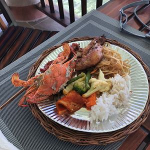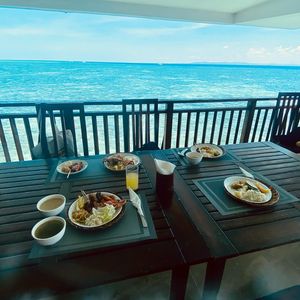 食事付きなので風が吹き抜けるレストランで。飲み物は自腹、ジュースは美味い。釣り、ボート、カヤックなどは有りませんでした。