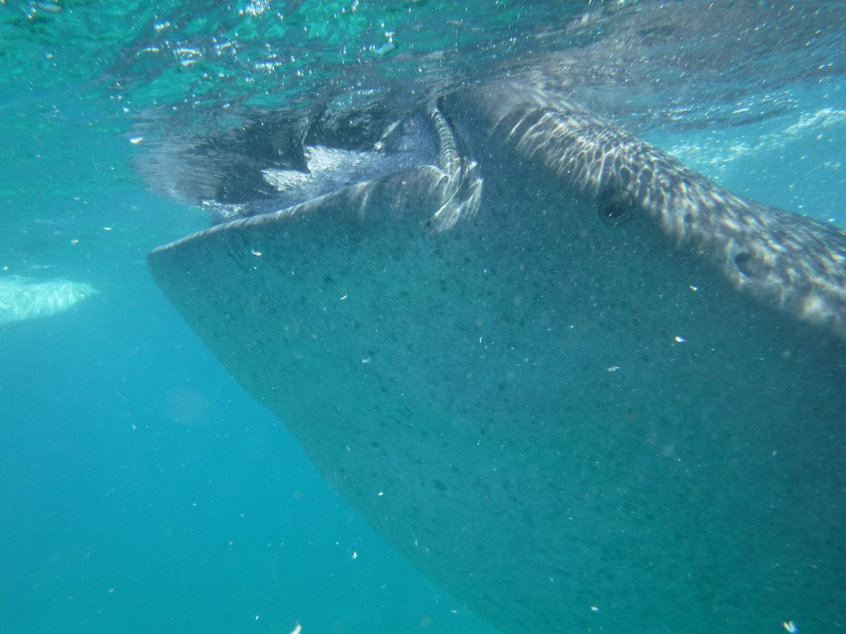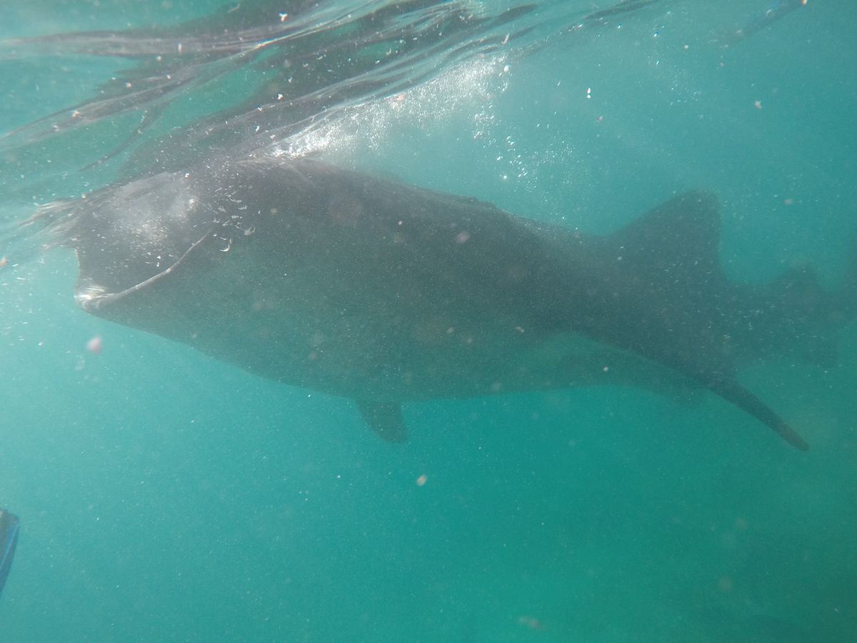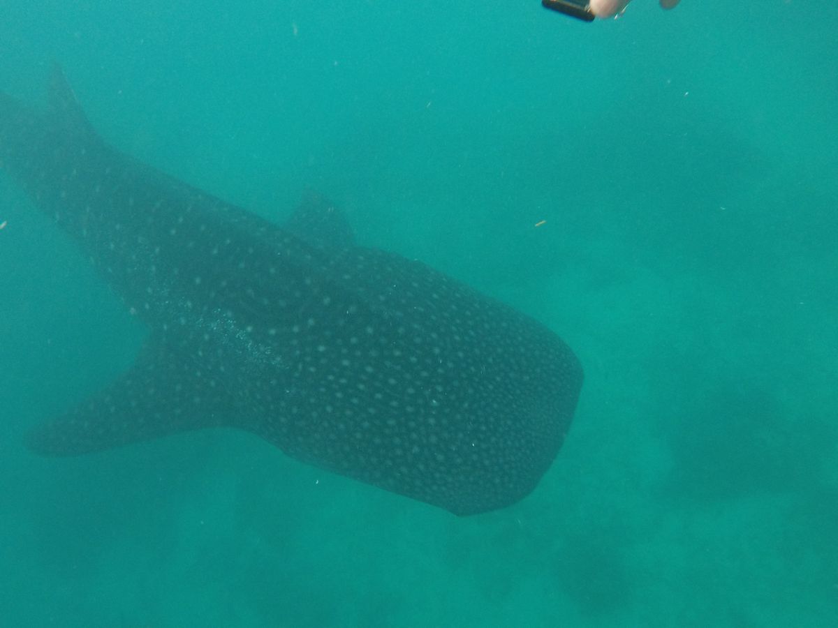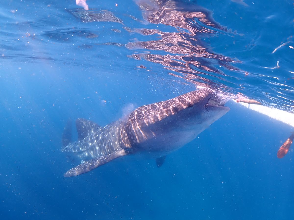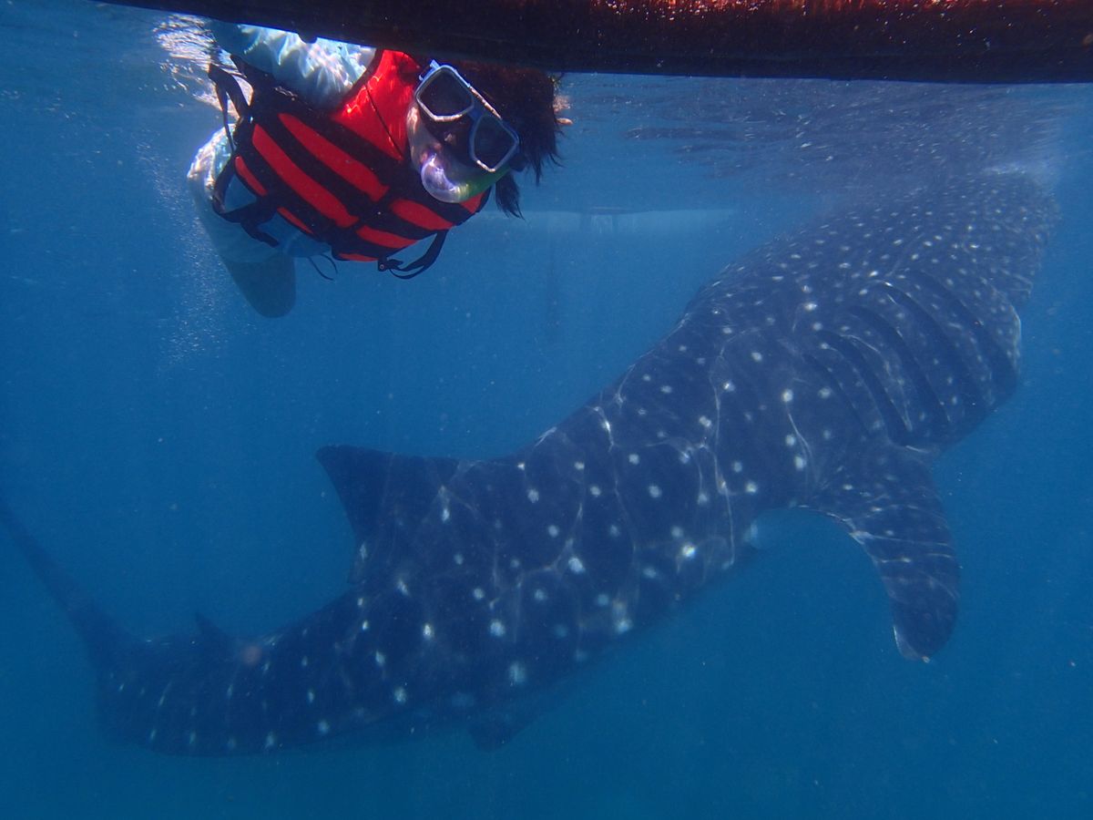 10分ほどボートに乗り沖に出ます。すでに優雅に泳ぐジンベイザメの姿が確認できました。ポイントに到着後シュノーケルを装着し海にダイブ。大きなジンベイザメが目の前を泳ぐ姿に感動しました!怖さなどは全くなくとても愛らしかったです。ジンベイザメは餌を撒くボートを追いかけるように泳いでいるので、1匹通り過ぎるとまた違うボートと1匹が来て、その後また2匹来て...というように数回に渡り目の前を通り過ぎて行きました。なので一緒に泳ぐタイミングは一度きりではなく写真撮影も何度もトライできました。とても貴重な経験となりました!