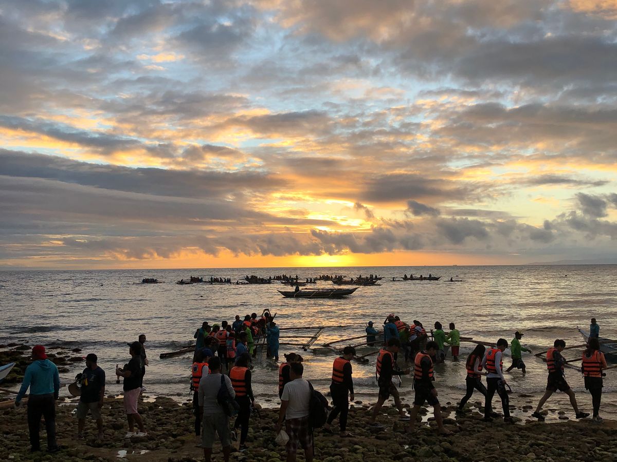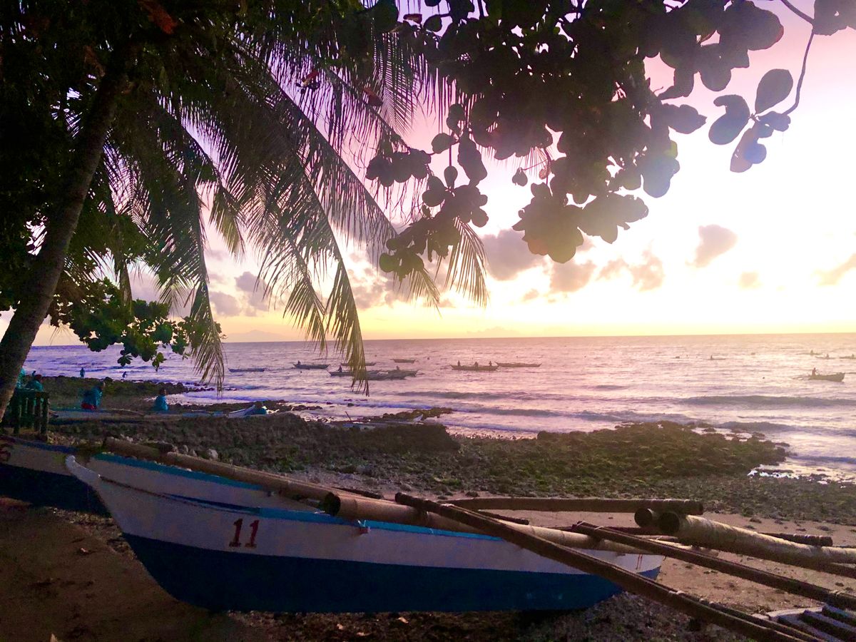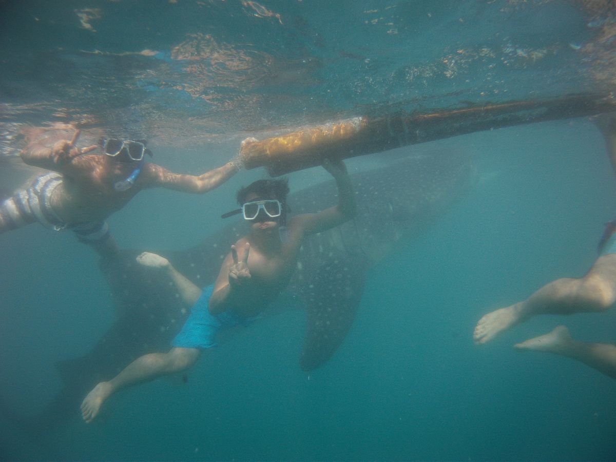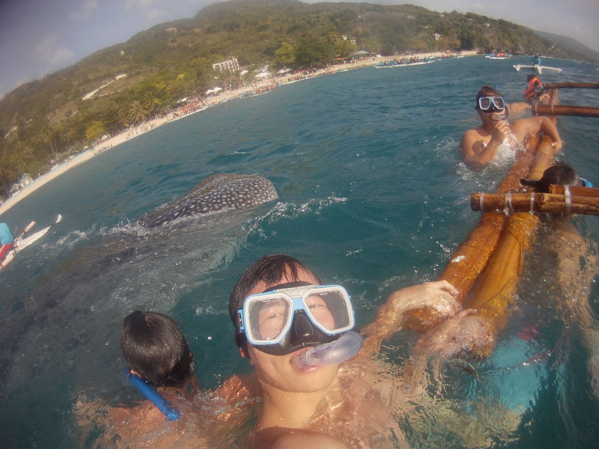 お天気にも恵まれ、美しい初日の出を眺めながらのシュノーケリングを楽しめました。10人くらいずつにボートに乗って出発するのですが、この時期のセブはどこも混んでますから、少し海岸で写真など撮りながら待つことになりますが、着替えたりトイレに行ったりしているうちにあっという間に順番が回ってきます。ボートに乗るのに水に足を入れると学校のプールより少し低いくらいの水温でした。海岸から数十メートルほど離れるとすぐにエントリーポイントに到着。持ち時間が決まっているので、ここからは結構急かされます。とにかく早く海に入れとのこと。海の中を見回してまもなくジンベイザメ発見。デカい、近い!これは来たかいがあったな、ラッキーと思いました。良く観察するとこの日二匹以上は近くにいました。GoProをレンタルしていたので、ボートのクルーさんがたくさんシャッターを押してくれました。せーの!と日本語で声掛けしてくださり、まるで水泳教練のよう。息継ぎで海上で休んでいると、近くにジンベイがいるから、とにかく潜れと急かされます。おかげさまで娘はジンベイザメとのツーショット写真をたくさん撮れました。