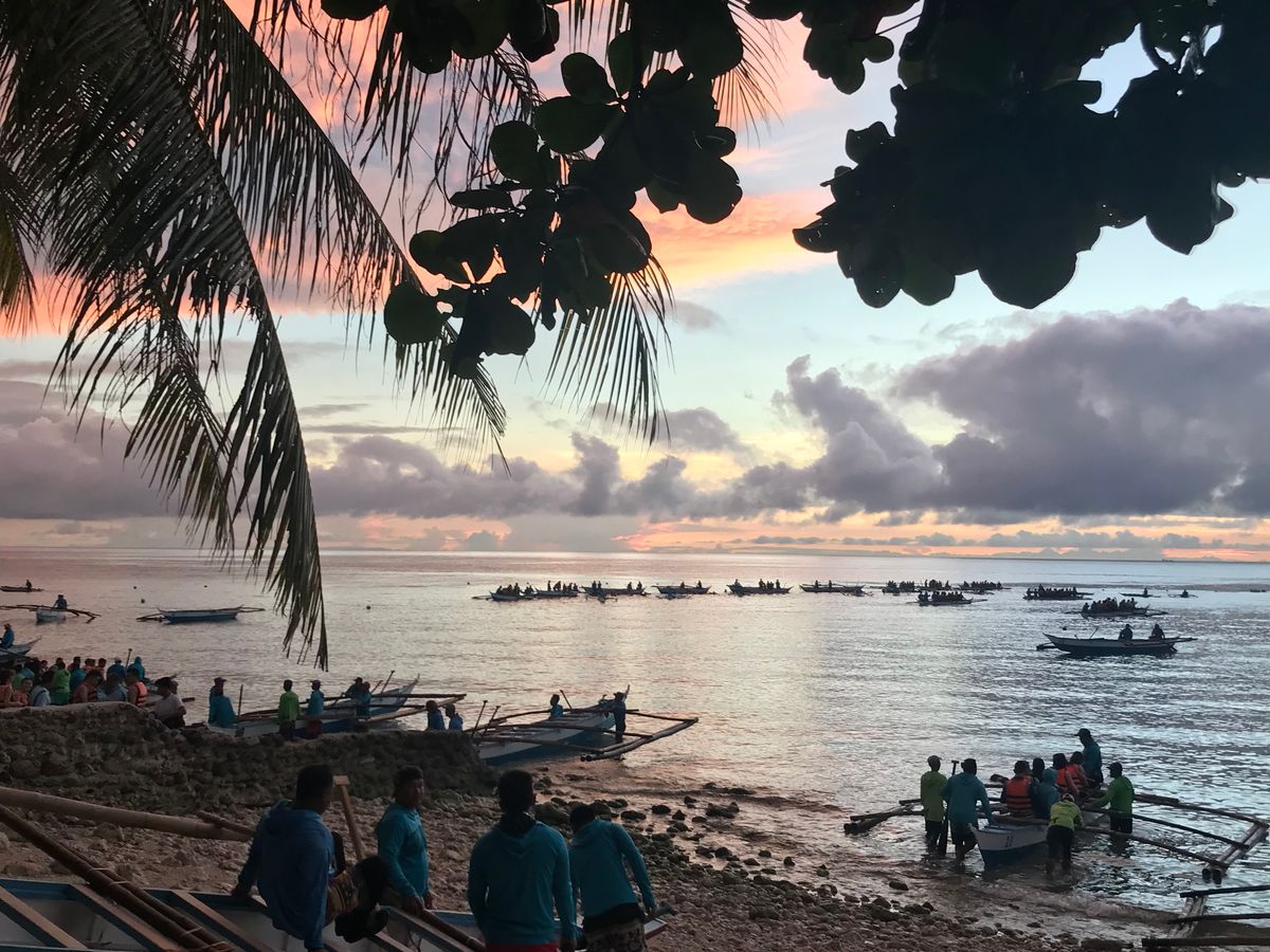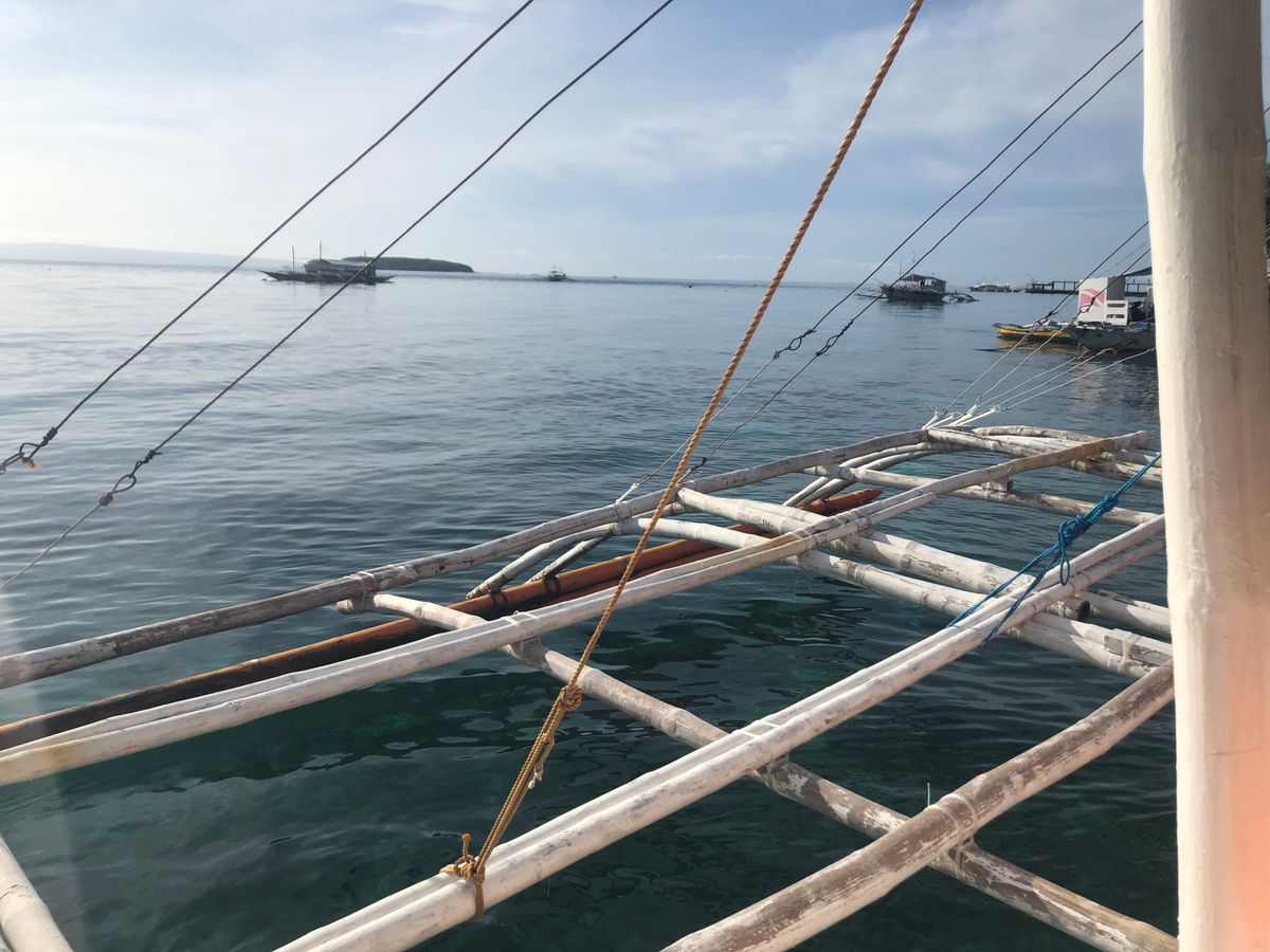 ジンベエザメと泳ぐには、小さなボートに乗り込み、少し沖へ出ます。