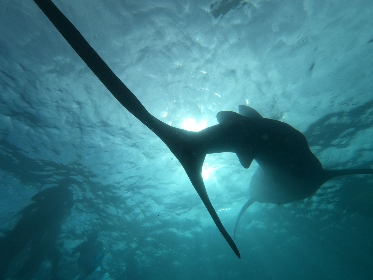 船乗りの方の合図で潜ると何匹も大きなジンベイザメがすぐそこに!