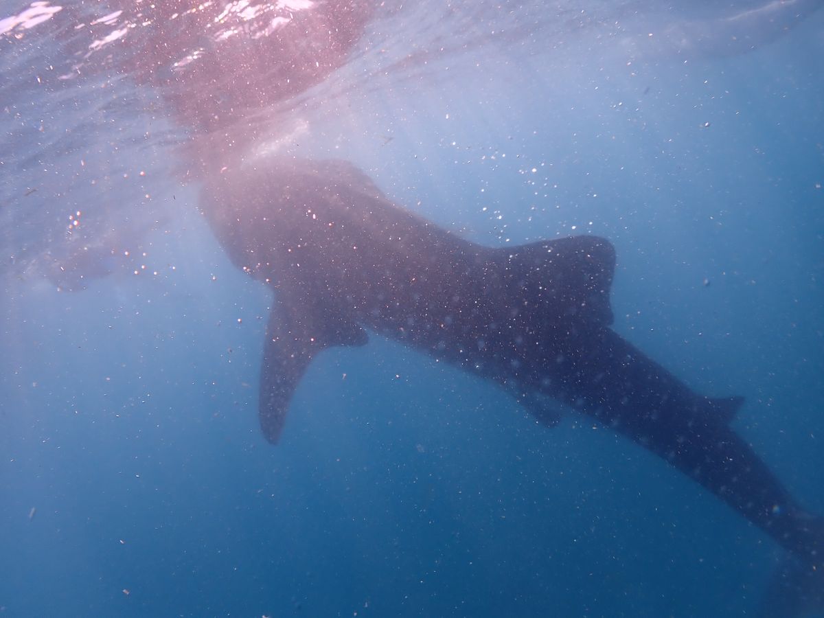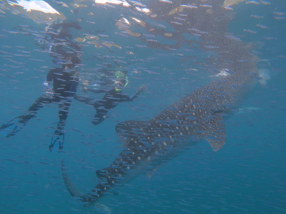 とてもいい体験になりました。ジンベイザメが、本当に触れてしまうのではないかと言うくらい近くで泳いでいて、感動しました。1匹のみならず2匹3匹と近づいてきて圧巻でした。シュノーケリングは初心者ですが、船頭さんがサポートをしてくださったおかげで特に問題なくジンベイザメと泳ぐことができました。写真撮影ですが、全て船頭さんに任せることが出来たため、自分はジンベイザメを見ることに専念できました。もちろん、ジンベイザメとの写真も撮影してもらえました。あまり天気も優れなかったため、見られなかったらどうしようと心配でしたが、バッチリ見られて良かったです。視界もクリアだったと思います。片道3時間以上と長旅にはなりますが、おすすめできるツアーです。