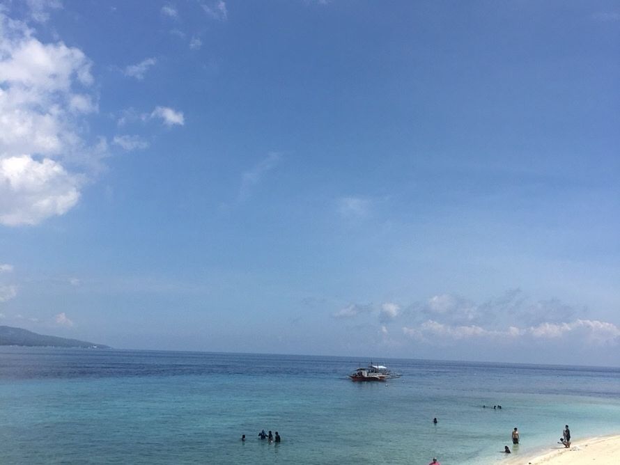 マクタン島内のホテルから、ワンボックスカーで凸凹道を4時間かけてオスロブへ向かいました! そこから、船に乗って岸からすぐそこまで船で向かい、船から海へ入ると間近にジンベイザメが泳いでいて、あまりの大きさに圧倒されました。ゴープロをレンタルしたので、スタッフに写真をたくさん撮ってもらいました。