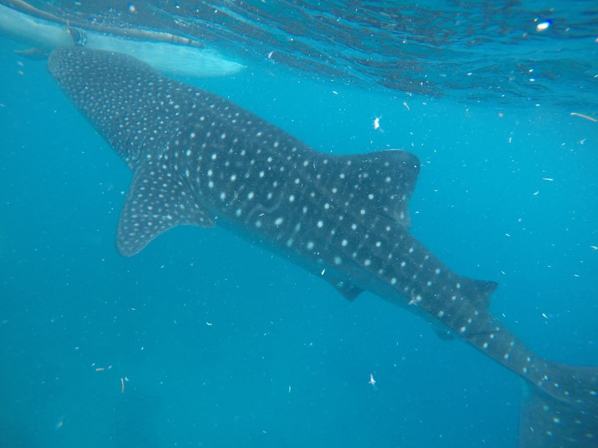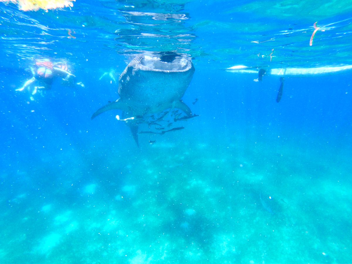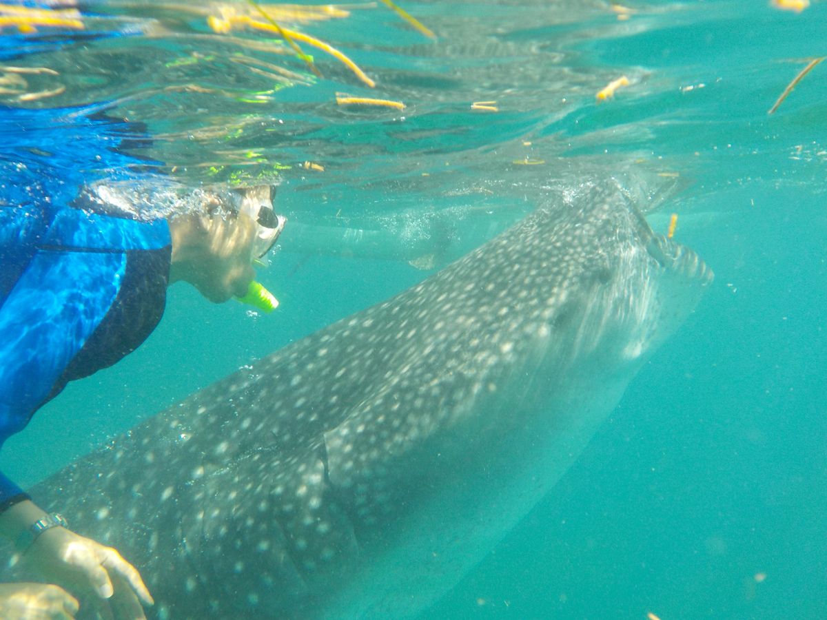 オスロブに到着すると、すぐにジンベイザメと泳ぎに行きました。ジンベイザメの見られるスポットまでは、手漕ぎの船で5分もかからないので、非常に近いです。ジンベイザメが数えられないほどいて、しかもほんの数メートルの距離!!ものすごい迫力でした!