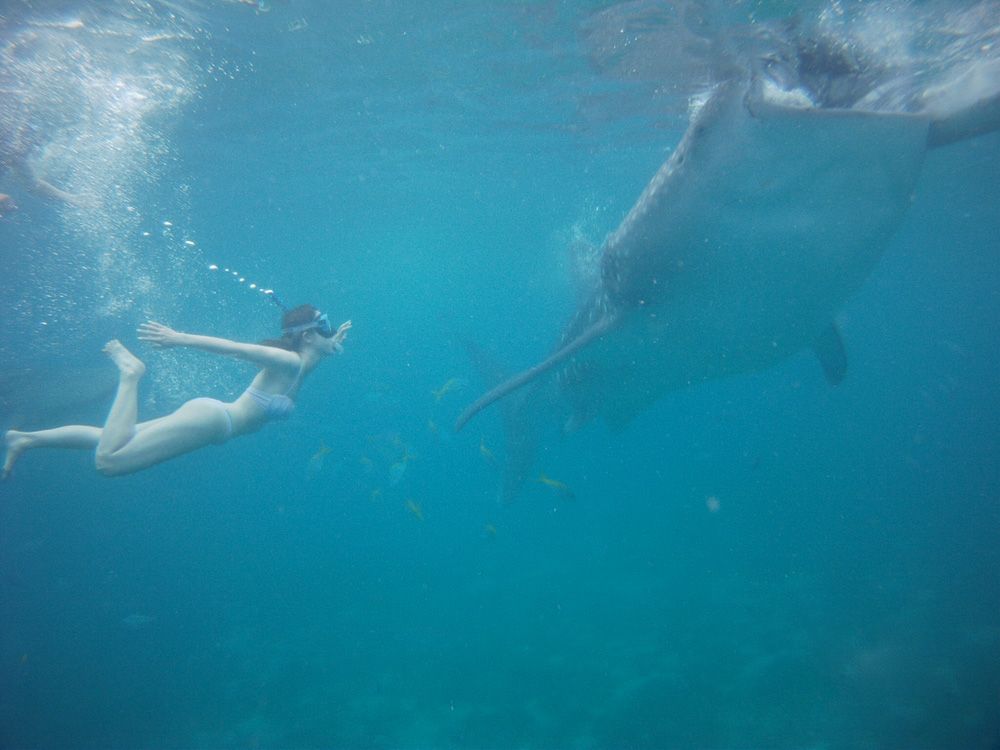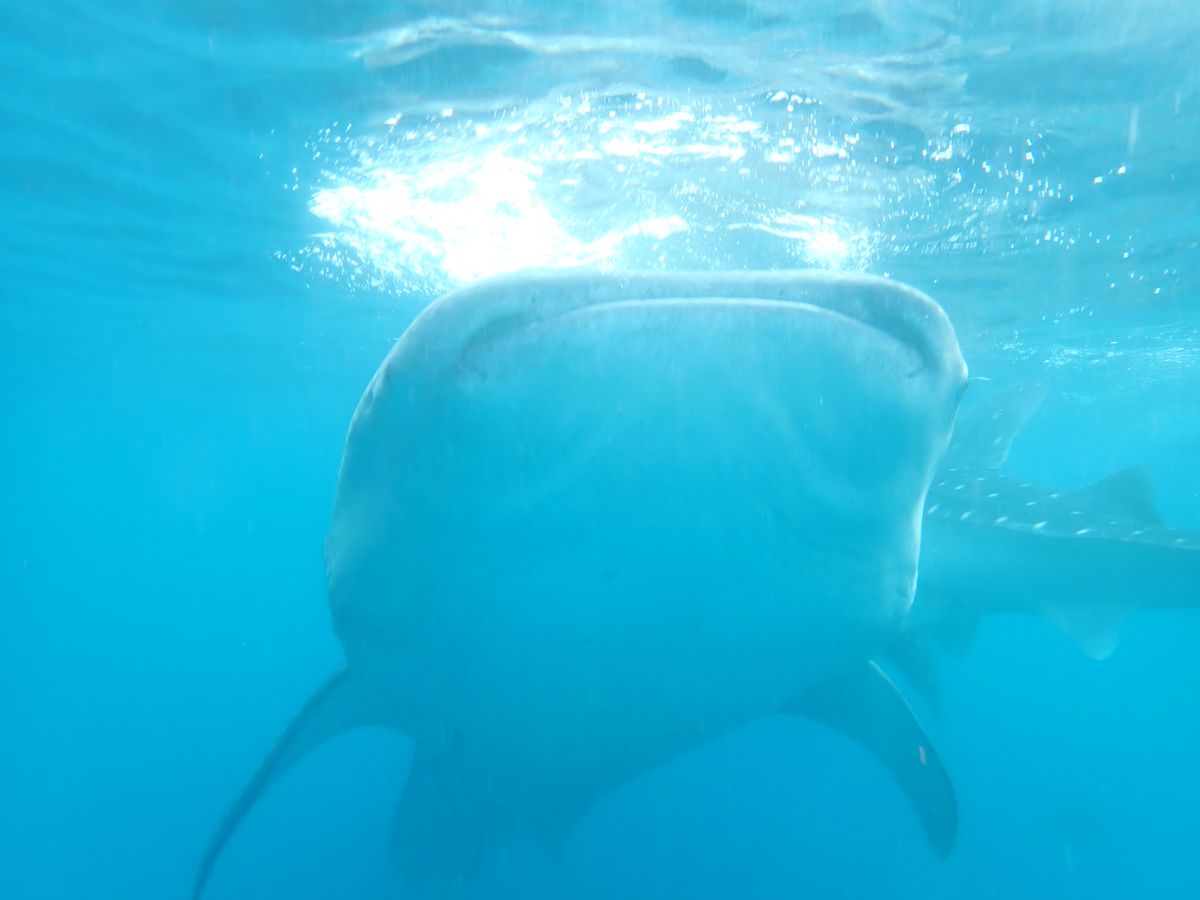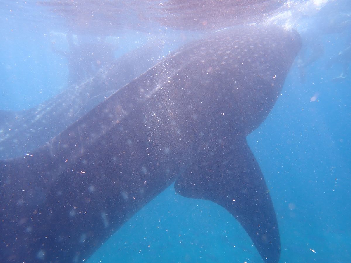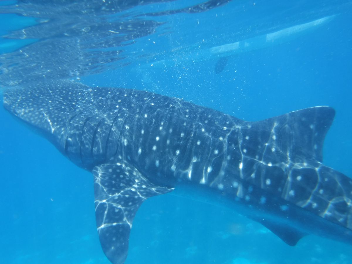 小さい船で少し沖まで出るとジンベイザメがたくさんいて、最初水面から見たときは怖いかも…と思ったけど、実際は潜るのに必死で怖いと思う暇もないです。笑