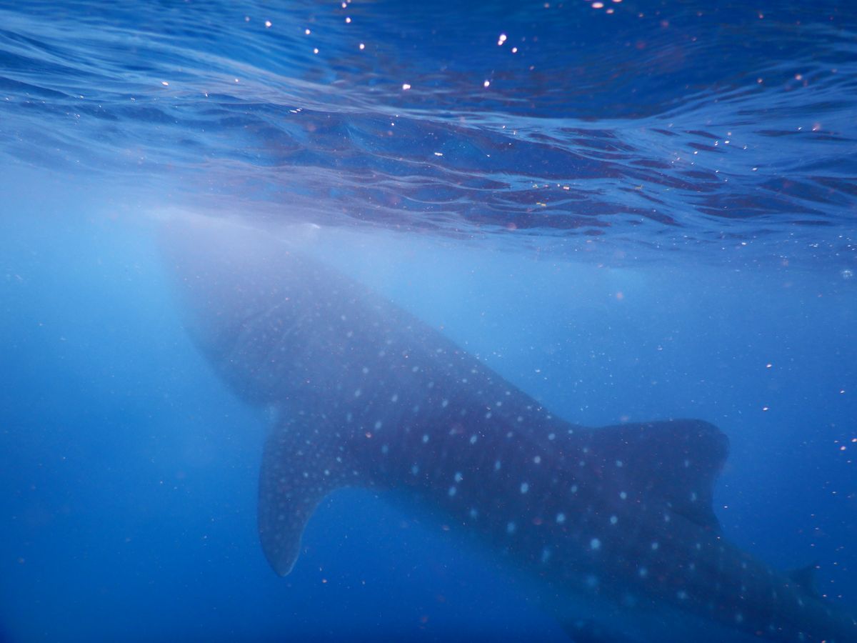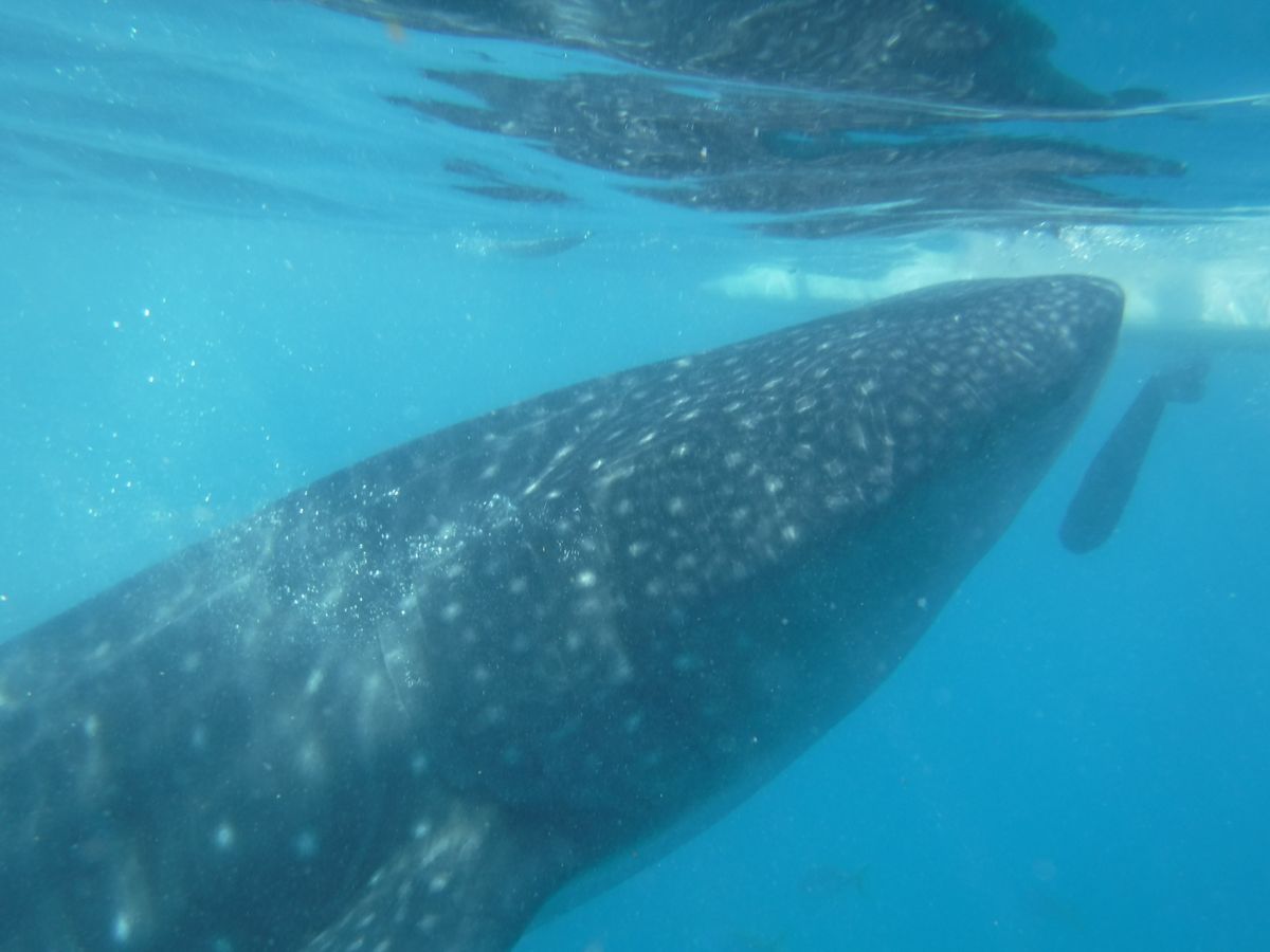 陸から漕ぐスタイルの小舟で5分ほど沖に向かうともうそこにはジンベエザメ。