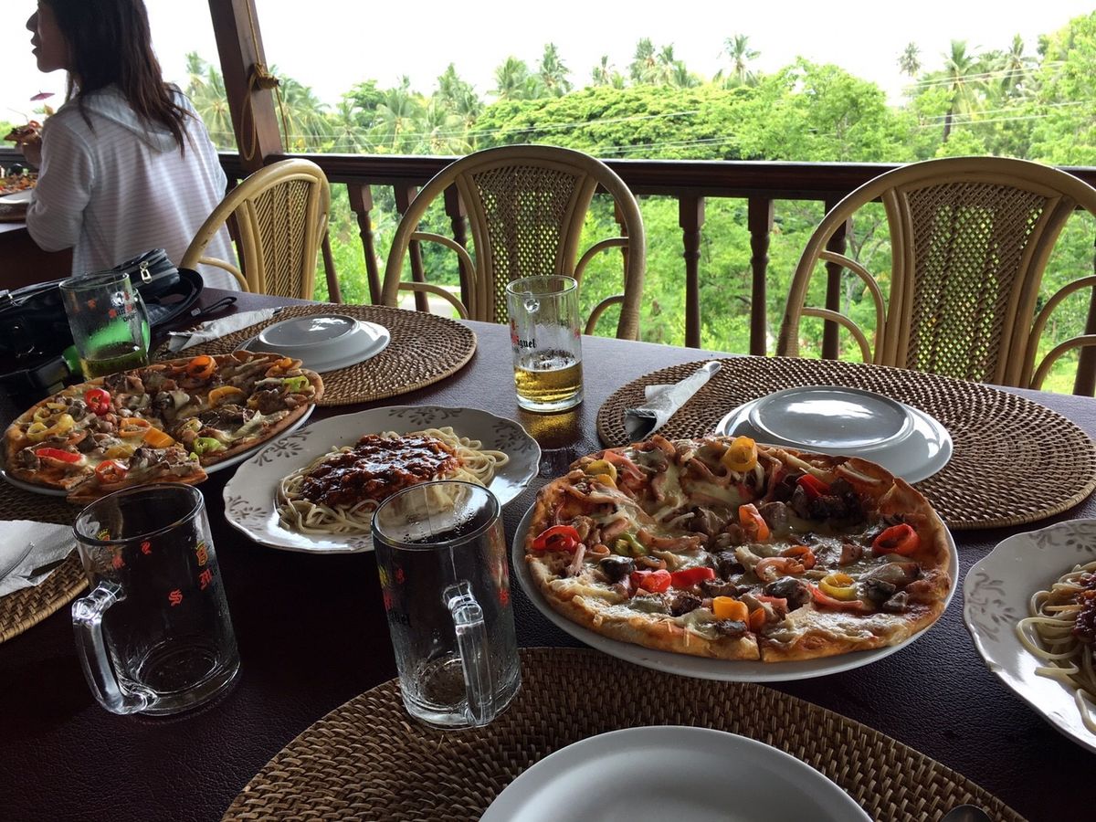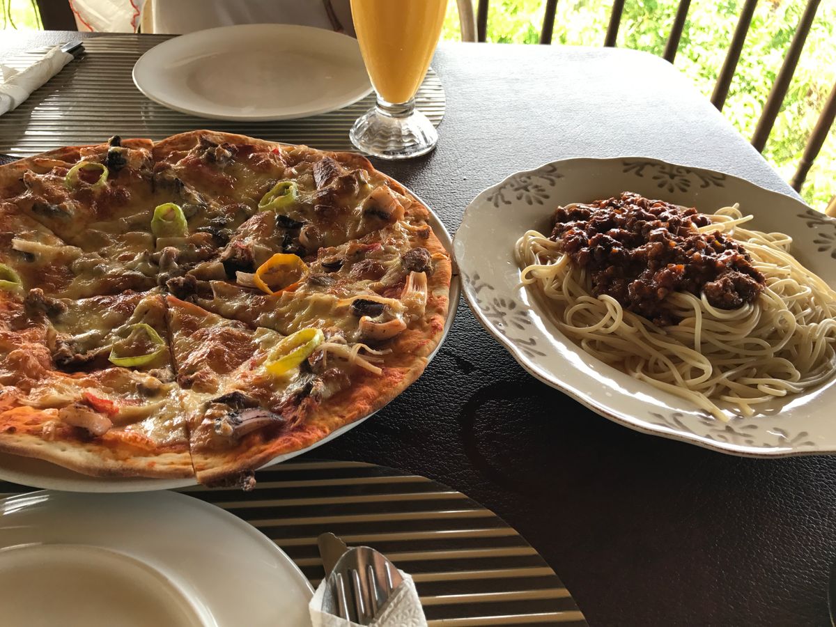帰り道の眺めの良いレストランで昼食。シーフードピザとミートソースのスパゲティ。