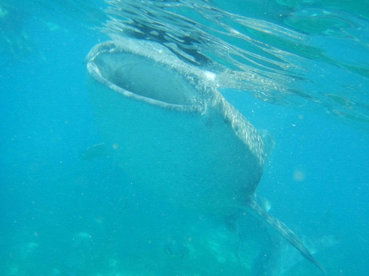 ジンベイザメは岸から数十メートルぐらいのことろにいるので、ひたすら一緒に写真を撮ります。間近で大迫力のジンベイザメたちを見ることが出来ます。