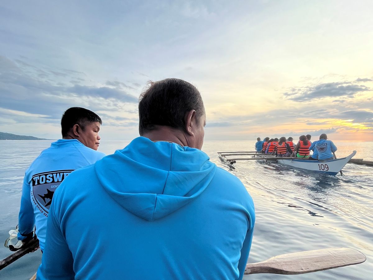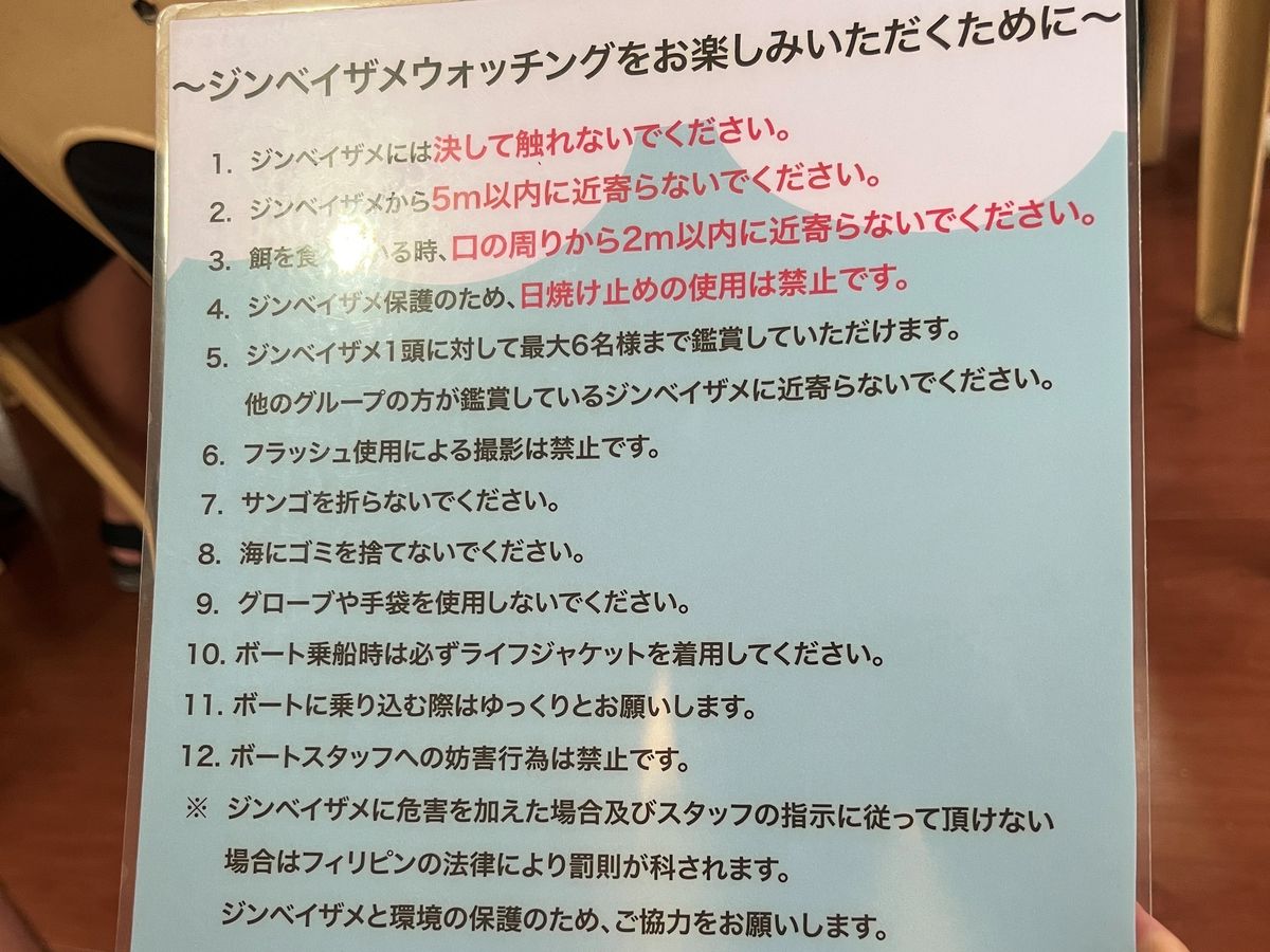 セブシティにあるホテルを4時に出発し、8時には現地に到着しました。水中カメラ(600ペソ)やシュノーケル(100ペソ)をレンタルしました。ゴーグルは無料で船上で貸してもらえます。シュノーケルは必須です!ゴーグルだけだと息継ぎのために定期的に水上に出てこないといけないので、連続してジンベイザメを見れません。また、今回フィンを持参しましたが大正解でした!マリンブーツや素足でも大丈夫ですが、フィンがある方がジンベイザメにスムーズについていけます。