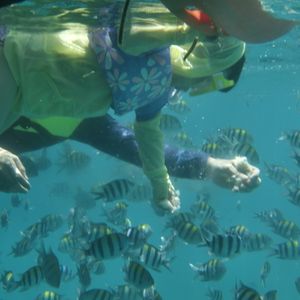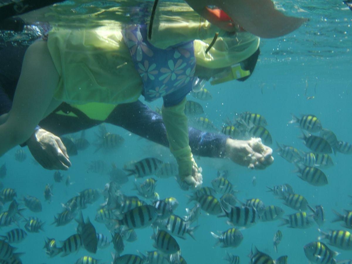 シュノーケルポイントではパンを持って入って頂くと多くの魚達が寄ってくるので
