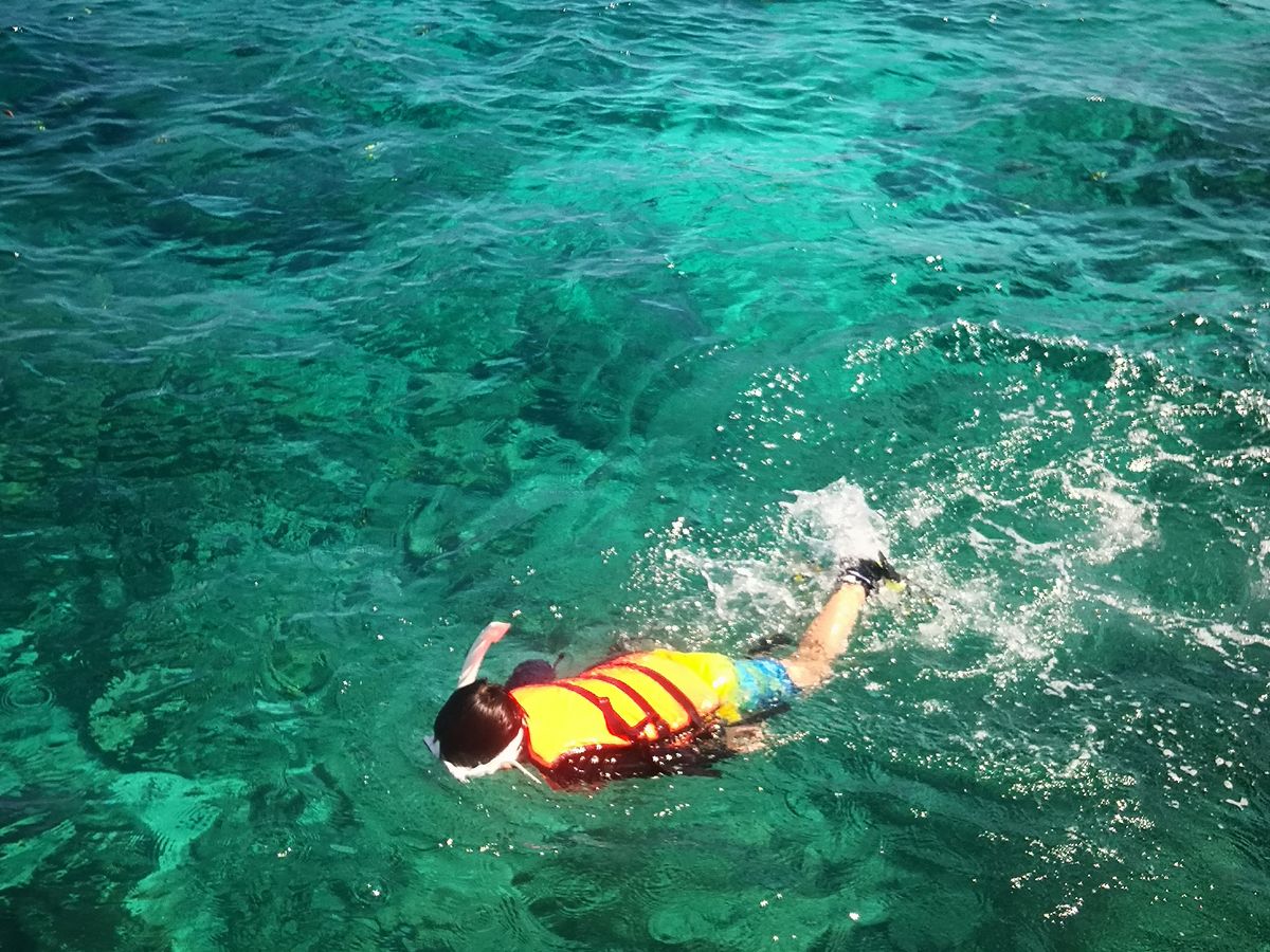 深さ3メートルくらいの所でシュノーケリングだったので、泳ぎに慣れたらベストを脱いで素潜りにも挑戦。魚にぐいぐい近づけます。