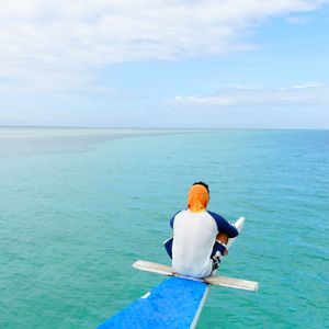 小さなボートから大きなボートへ乗り移り、海へと旅に出ます。