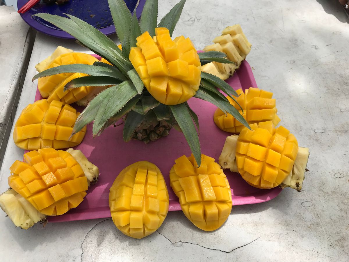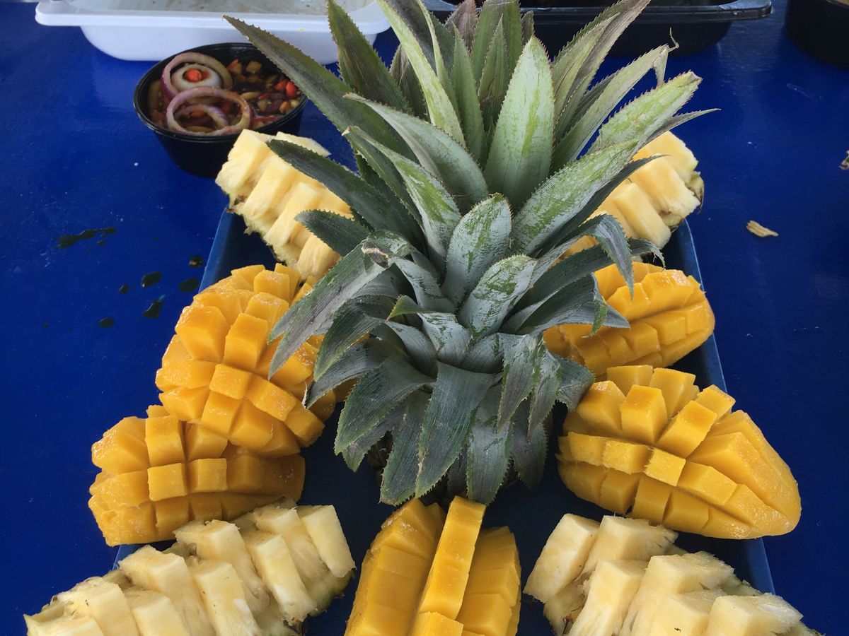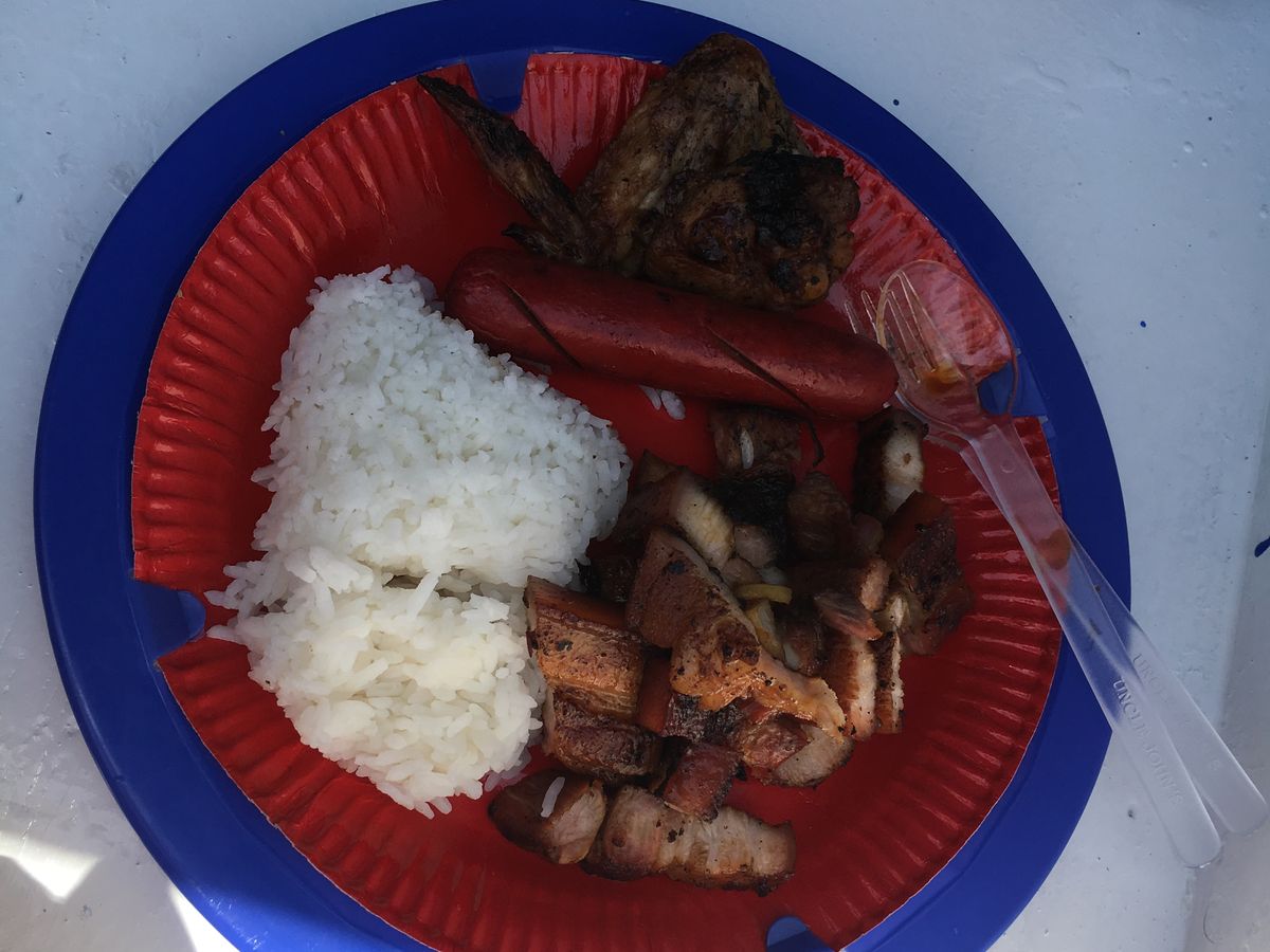ライス、豚、手羽、ソーセージ、あとマンゴーが一人半分とパイナップル1.2切れずつくらい。フルーツは綺麗に盛り付けられ間違いなく美味しいですし、ごはんも変な味ではないですが、残念でした。ちなみにこちらの写真にある海鮮は別売りです。現地の人が売ってます。