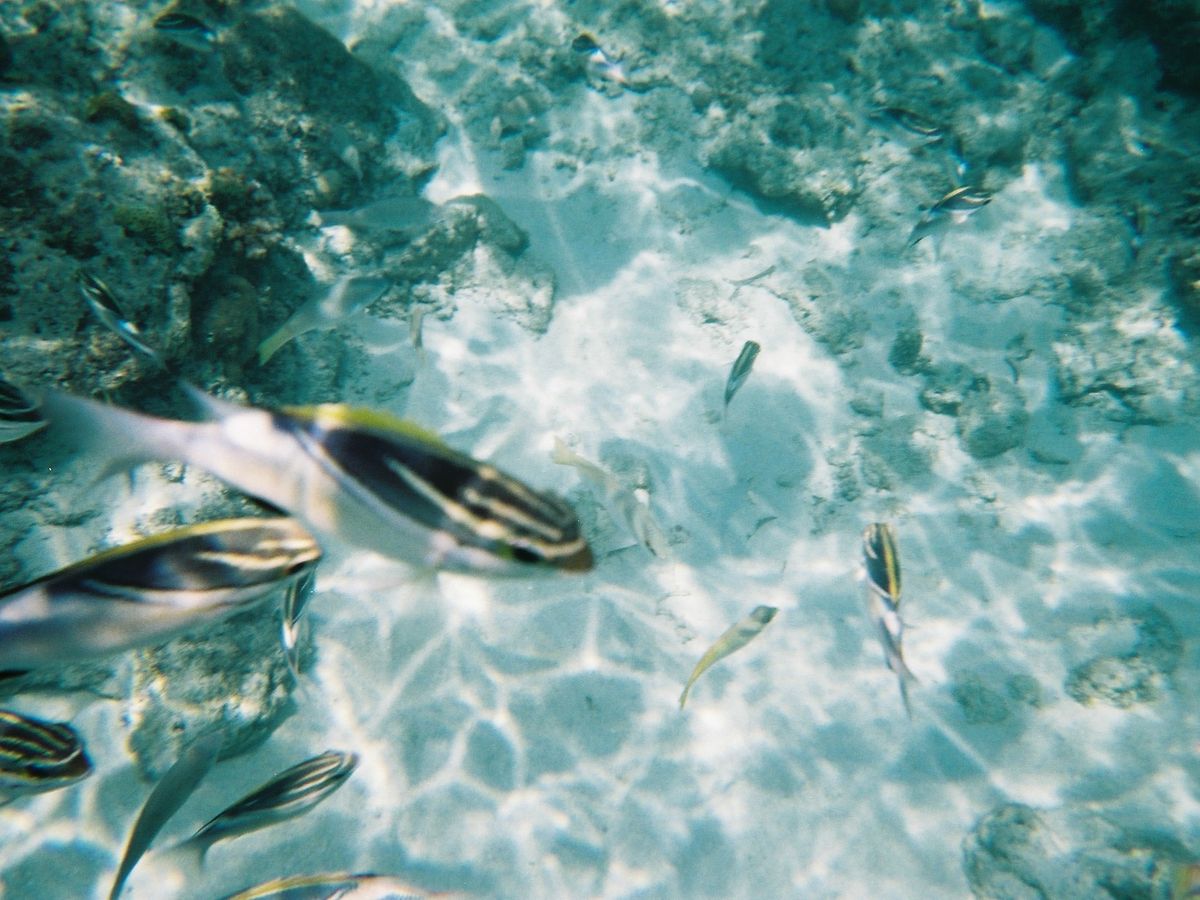 集合後にボートで1時間程でダイビングスポットへ到着、穏やかな綺麗な海でかつ魚も沢山いました!乗船員さんがくれるパンを持って海に入ったらとにかく凄まじい数の魚が集まってきました〜