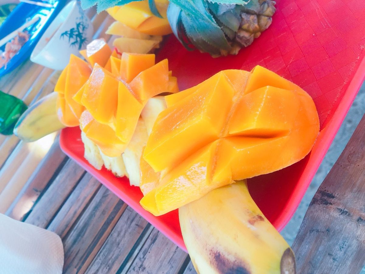 スタッフは全部で6人ほど?いましたが、その中で日本人は一人で基本的に説明などはその人がしてくれました。他の現地スタッフのお兄さんたちは日本語はカタコトでしたがしっかりと気配りをしてくれて大満足です。こまめに写真を撮ってくれたりダイビングの用意もテキパキ、飲み物も栓を開けて配ってくれたりと気遣いが行き届いていました!昼食のバーベキューはスタッフが焼いたものをワンプレートによそって食べるだけなのでバーベキューといえるのか…?と思いましたがデザートで食べたかったマンゴーが理想の形でててきたところは満足です。