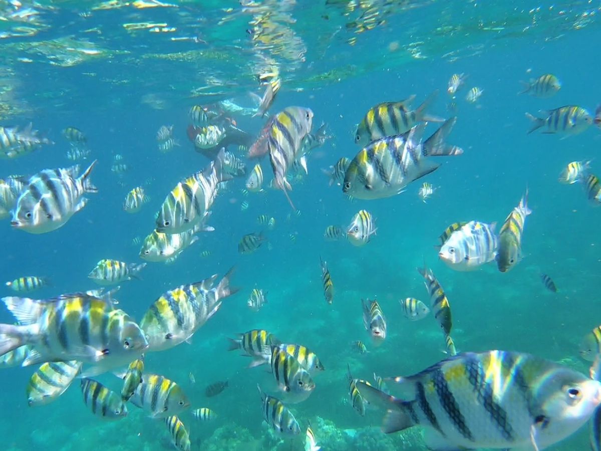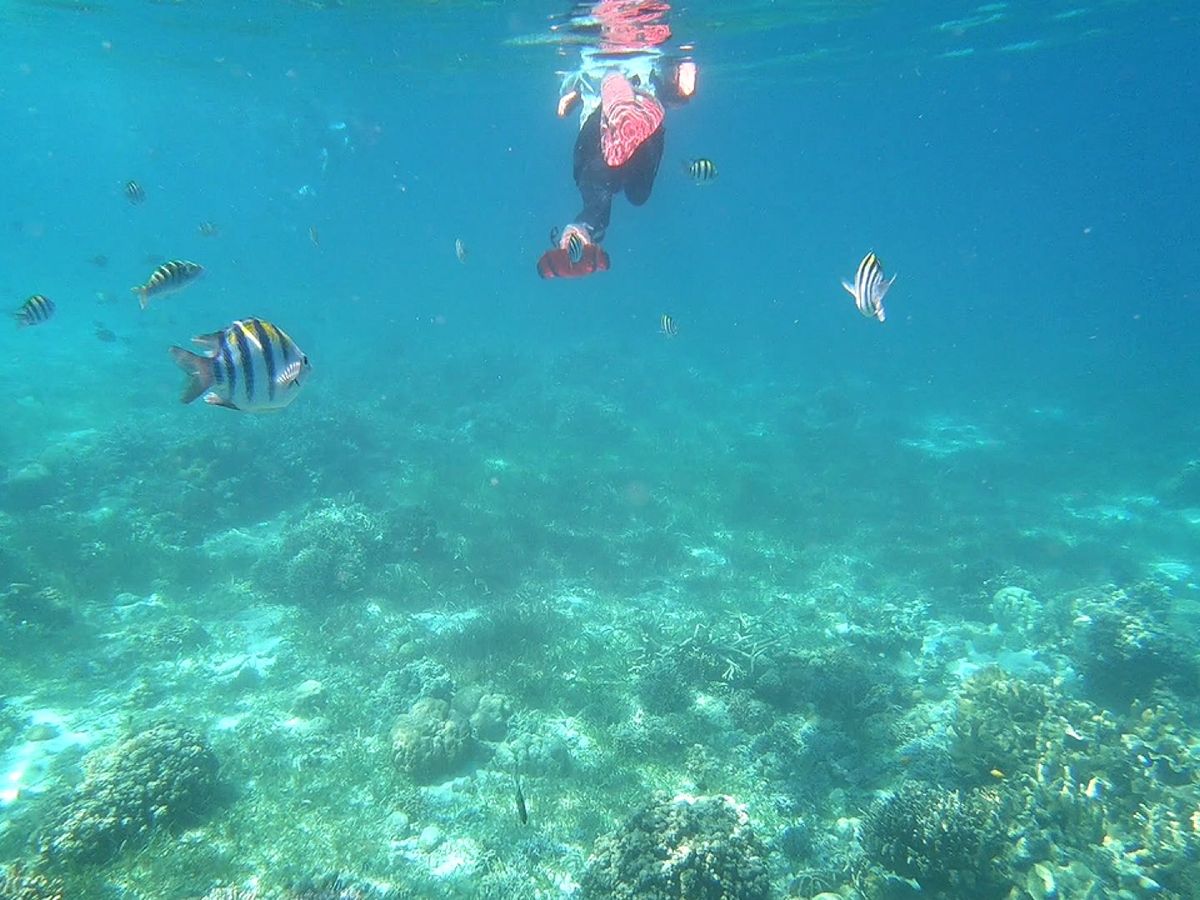 ヒルトゥガン島でのシュノーケルは、海は透き通っていて熱帯魚をたくさん見られます。
