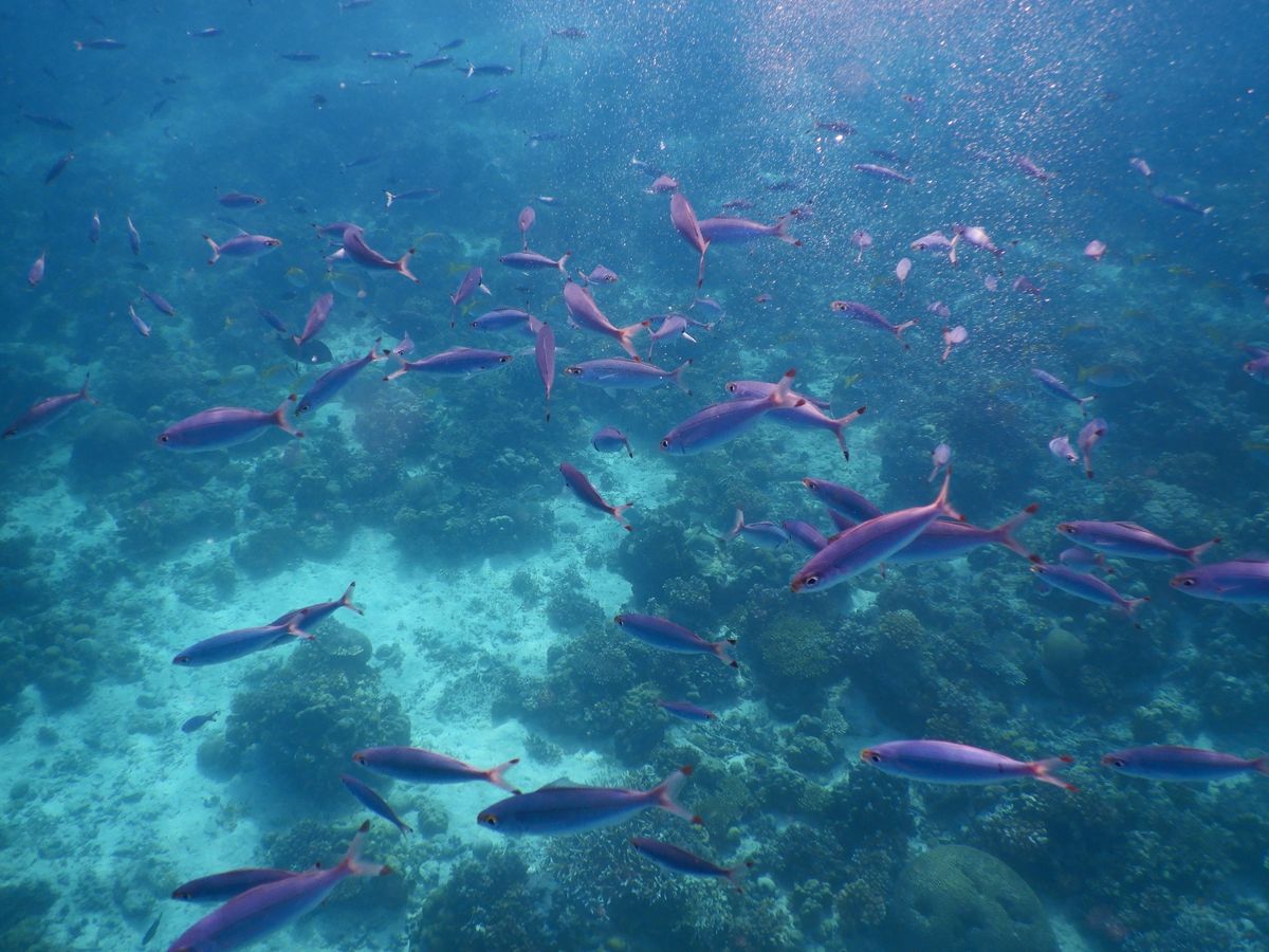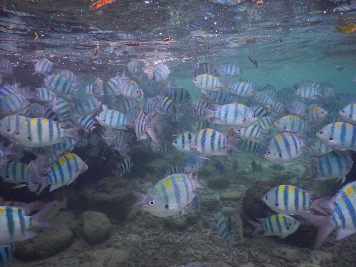 ナルスアン桟橋下のシュノーケリングスポットにはものすごい量の魚がいます。ここもまたオヤビッチャ祭りですが、オヤビッチャ以外にもたくさんいます。