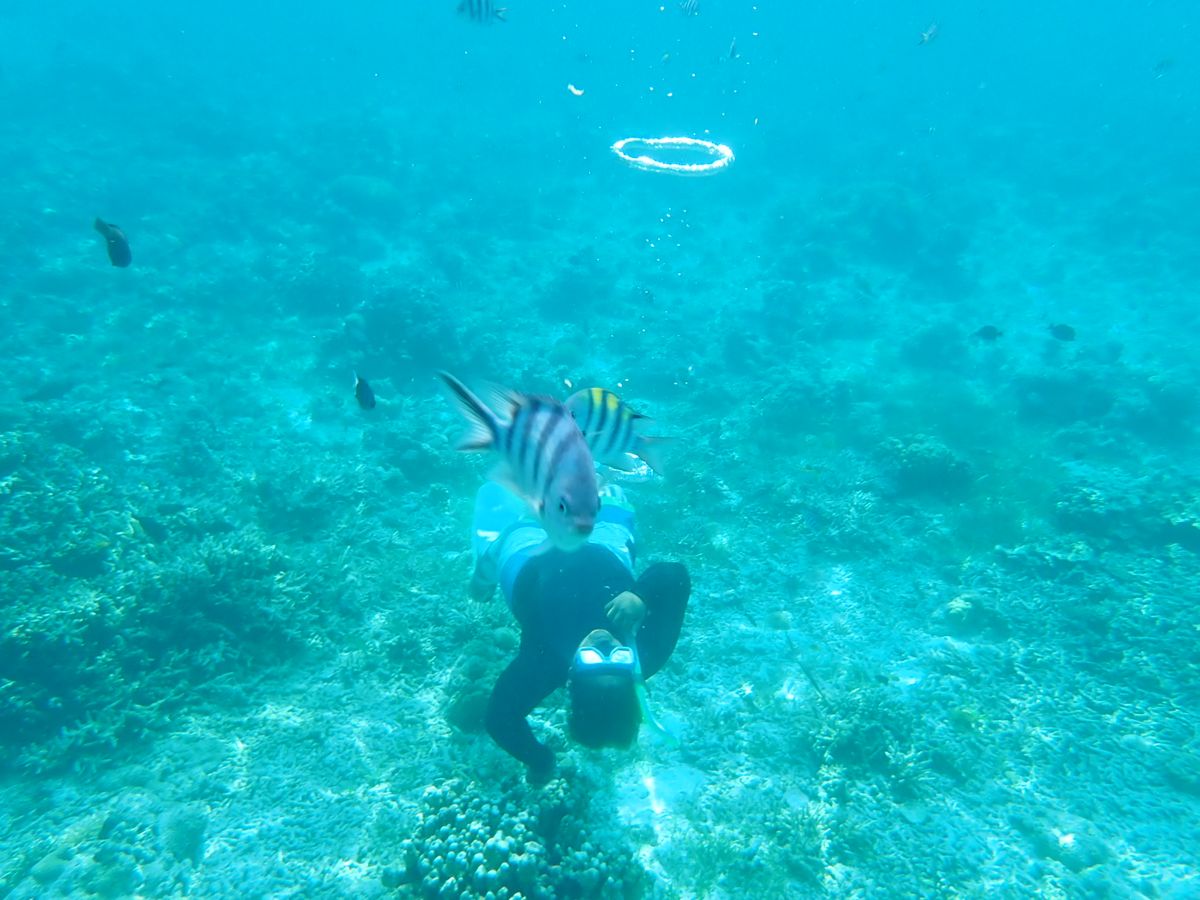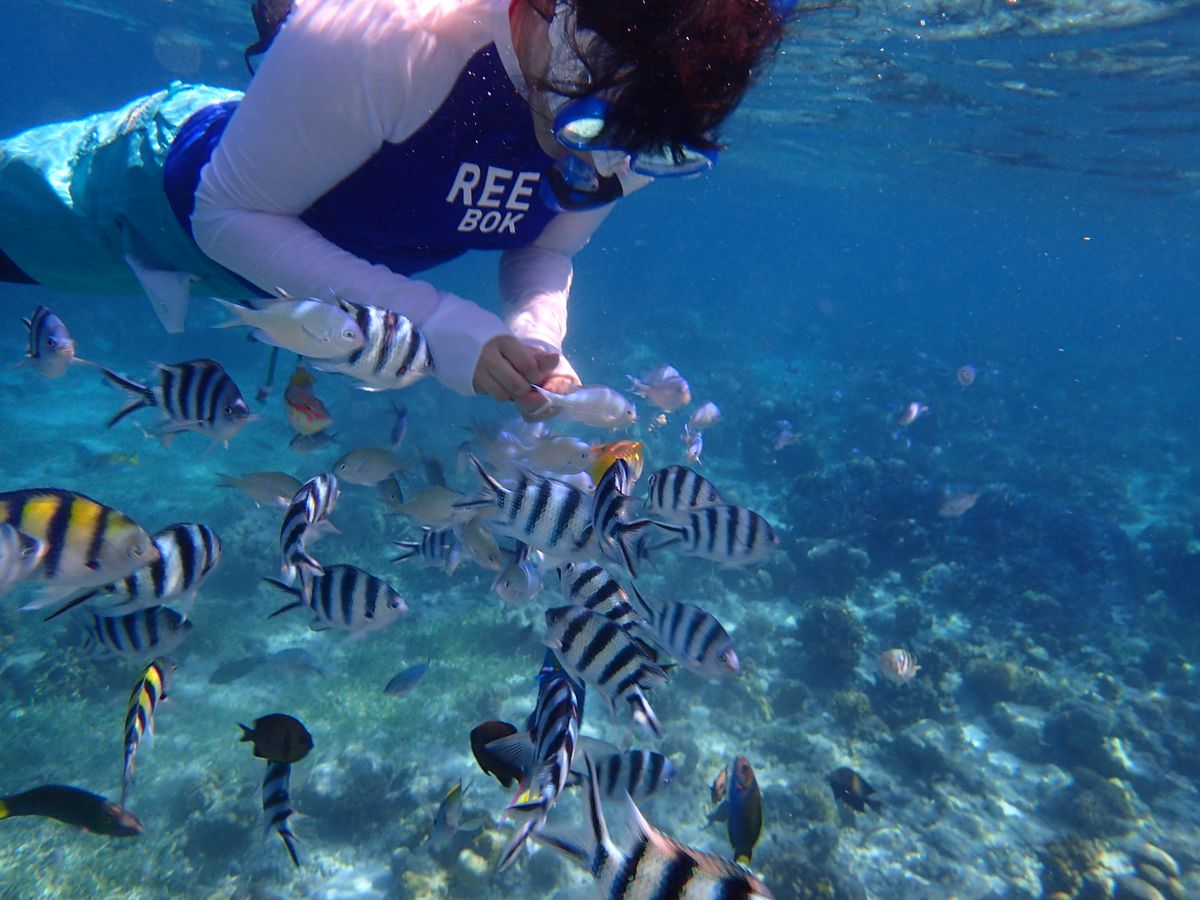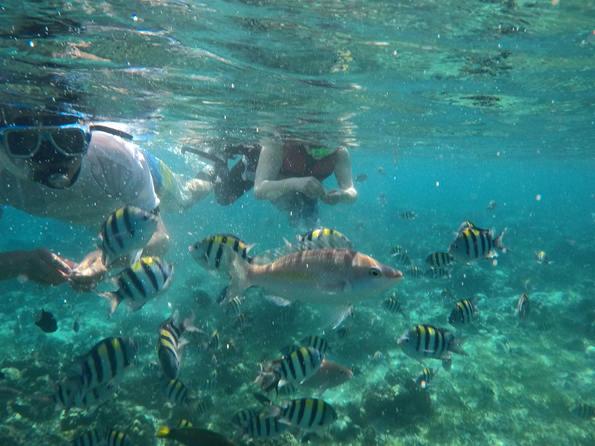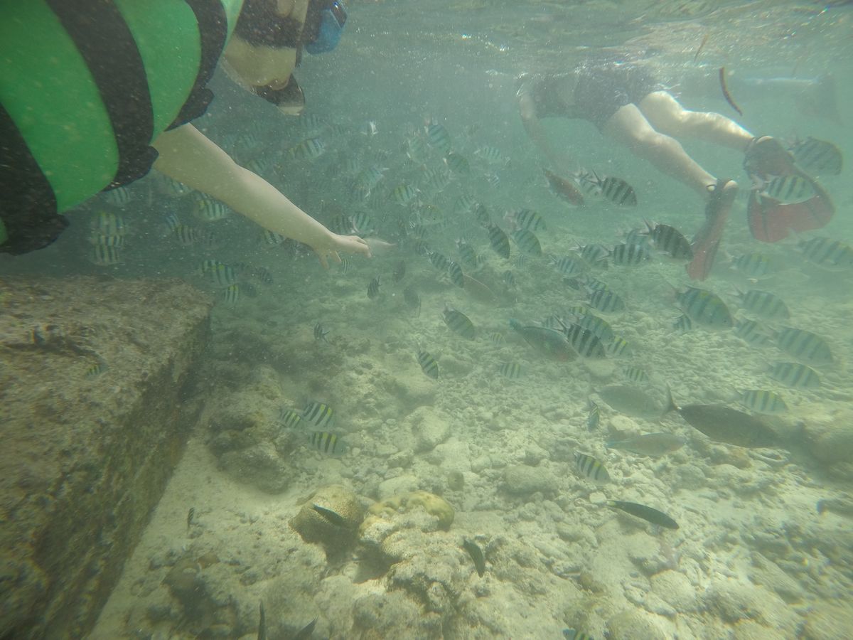 1時間半ほどで到着し、船に乗り込みさらに40分程経つと初めの場所、ヒルトゥガン島に到着。と言っても島には上陸せずに近くまで行き、そこでシュノーケリングをしました。海はとても透き通っていました。餌としてパンをたくさんいただき、ちぎって海の中に入れると魚たちがたくさんやってきてくれました!海が透き通っているためか、写真がとても綺麗にとれました。GoProがあるととても便利です!貸し出しもできるそうですよ!