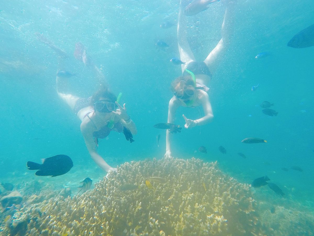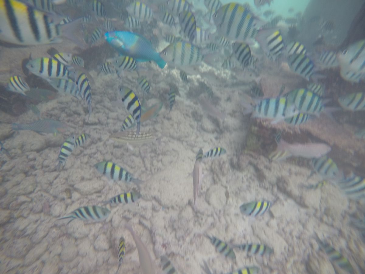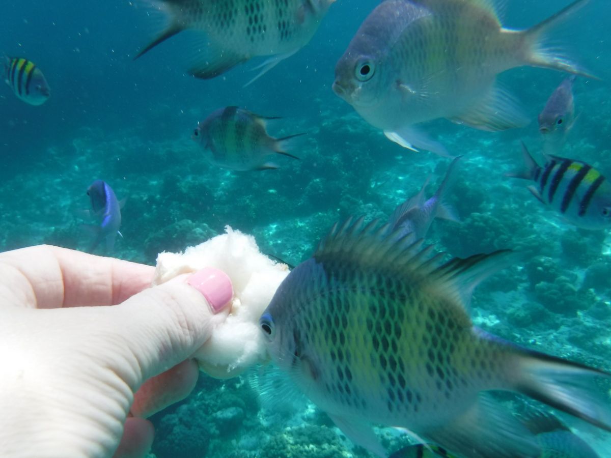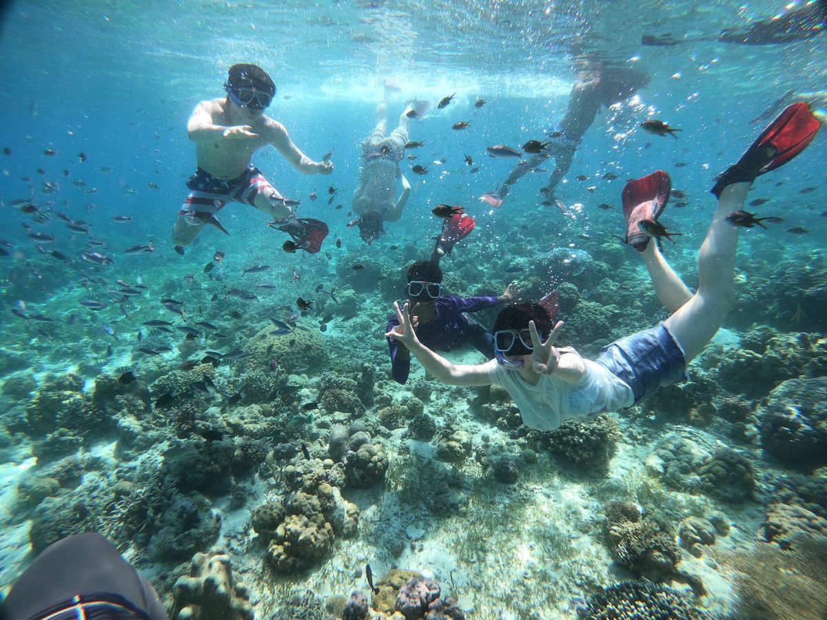 1時間半ほどで到着し、船に乗り込みさらに40分程経つと初めの場所、ヒルトゥガン島に到着。と言っても島には上陸せずに近くまで行き、そこでシュノーケリングをしました。海はとても透き通っていました。餌としてパンをたくさんいただき、ちぎって海の中に入れると魚たちがたくさんやってきてくれました!海が透き通っているためか、写真がとても綺麗にとれました。GoProがあるととても便利です!貸し出しもできるそうですよ!