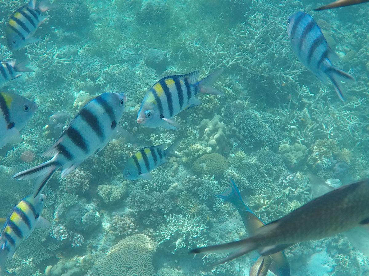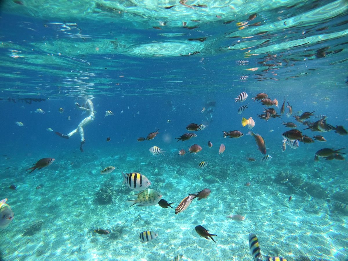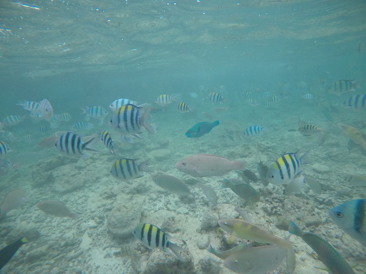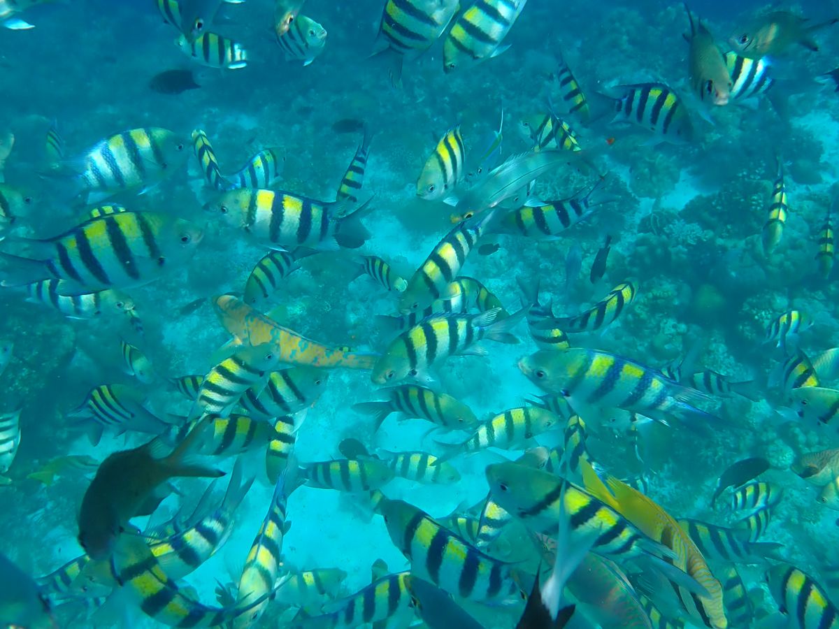 1時間半ほどで到着し、船に乗り込みさらに40分程経つと初めの場所、ヒルトゥガン島に到着。と言っても島には上陸せずに近くまで行き、そこでシュノーケリングをしました。海はとても透き通っていました。餌としてパンをたくさんいただき、ちぎって海の中に入れると魚たちがたくさんやってきてくれました!海が透き通っているためか、写真がとても綺麗にとれました。GoProがあるととても便利です!貸し出しもできるそうですよ!