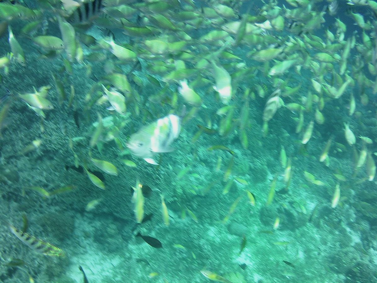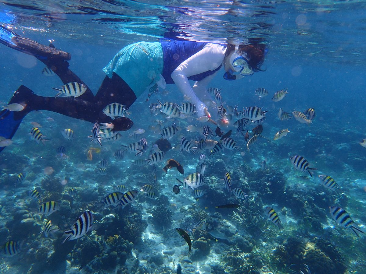 この日はとても晴れていたので景色も良く、シュノーケリングにも絶好の日和でした。まず船に乗って40分ほど走らせて着いたのがヒルトゥガン島。ここはシュノーケリングがメインです。沖合で船を停止してシュノーケリングが始まります。始めはシュノーケルをうまく使えず、苦戦しましたが海の中をのぞくとそこには魚たちの世界が広がっていました。配布されたパンを巻くと一目散に魚たちが寄ってきます。恐れることなくむしろ突っついてきます。日本では経験できない体験でした。