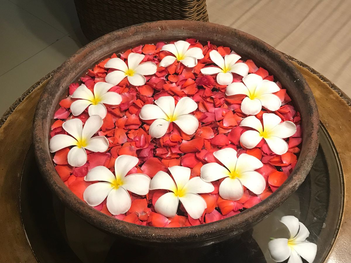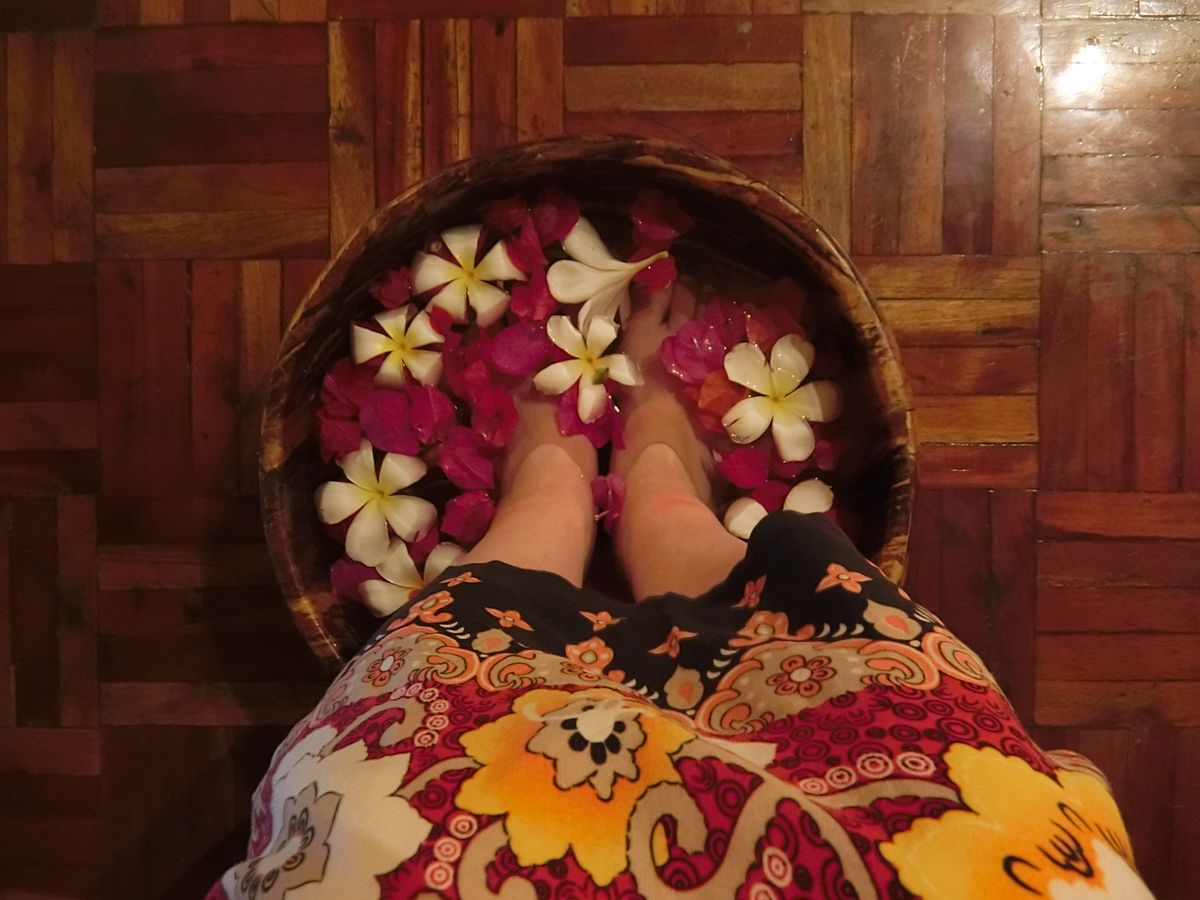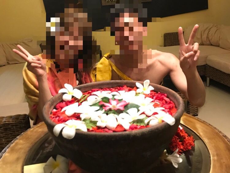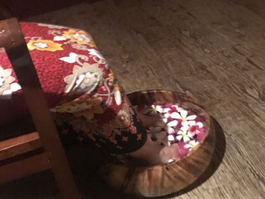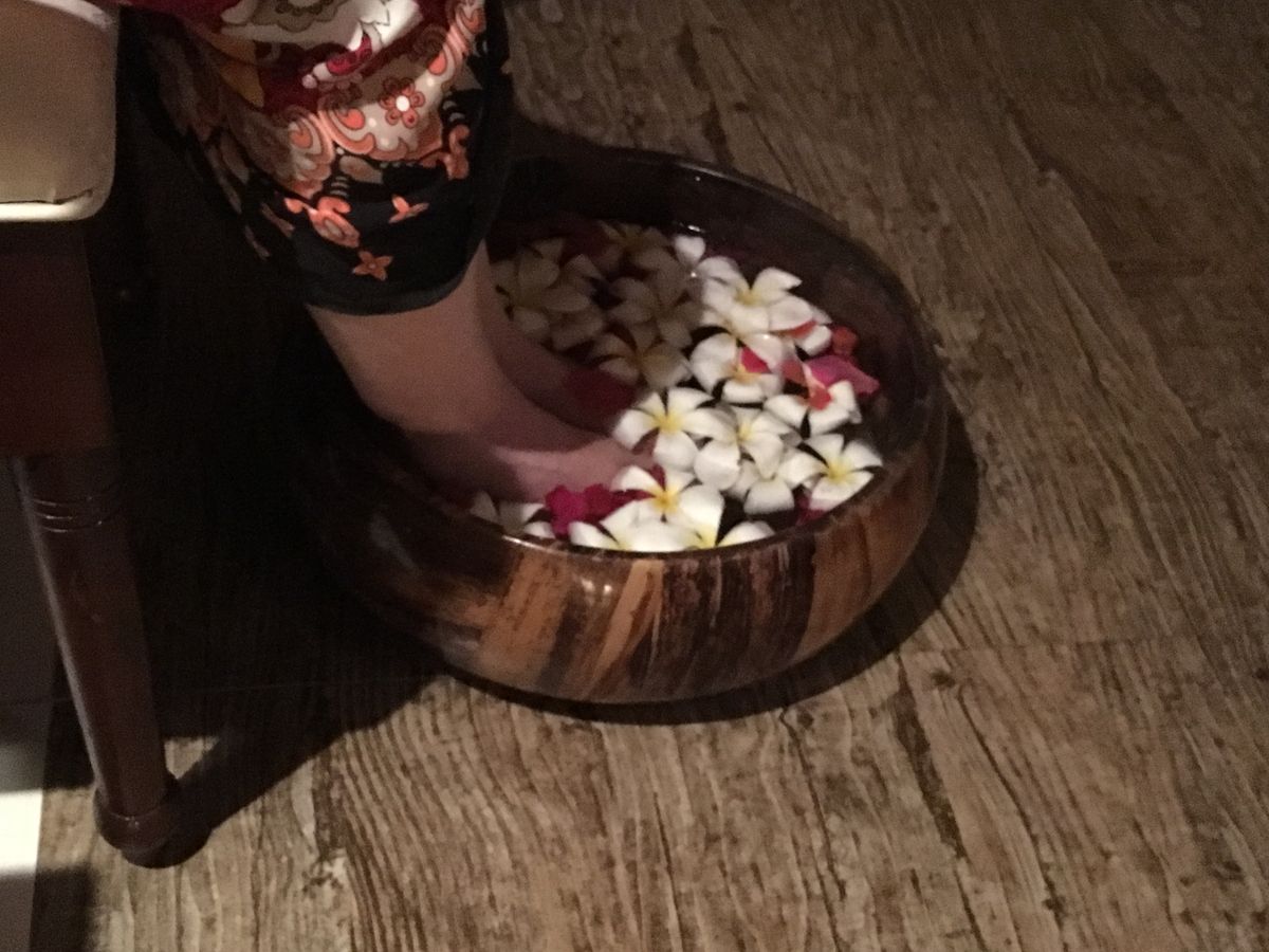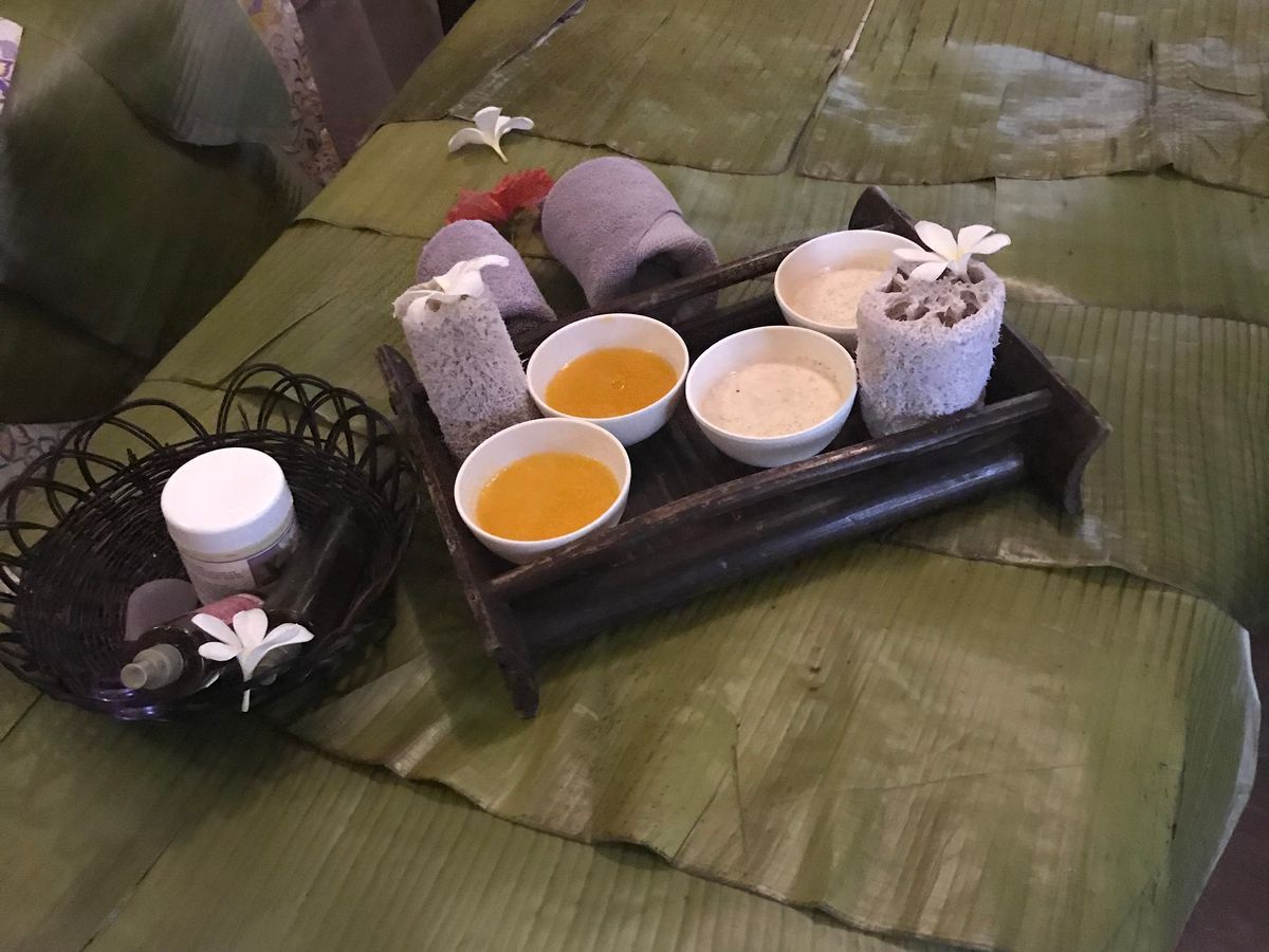 最初、足のマッサージから始まりオイルの香りを6種類?くらいから好きなのを選択できます。(ラベンダー、レモングラス、ローズ、ココナッツetc)その後、うつ伏せになり体全体にあまりいい匂いではないスクラブを塗布されました。大きなバナナの葉?の上に横になるのですが、ベタベタする感じがなんともリラックスできず、あまり居心地が良いものではありませんでした。今まで様々な国でスパを体験してきましたが、ベタベタする状態でバナナの葉の上に横になったり包まれたのは初めてでした。この時、本当に寒くてトイレに行きてくて仕方ありませんでした。10分くらいたった後にタオルの様なものでスクラブを拭き、プリメリアがたくさん浮かんでるお風呂に浸かりながらマンゴーとお茶をいただきました。