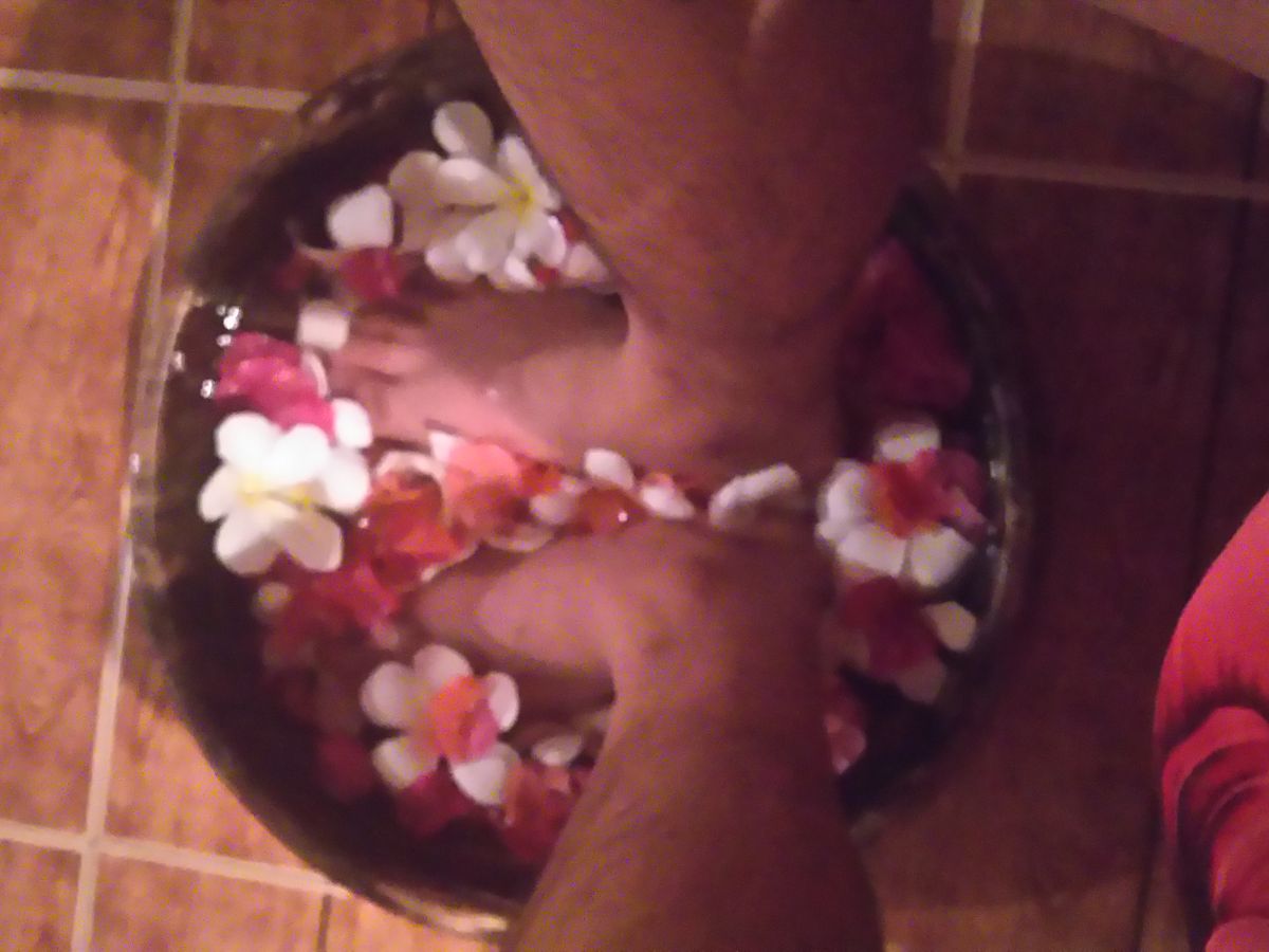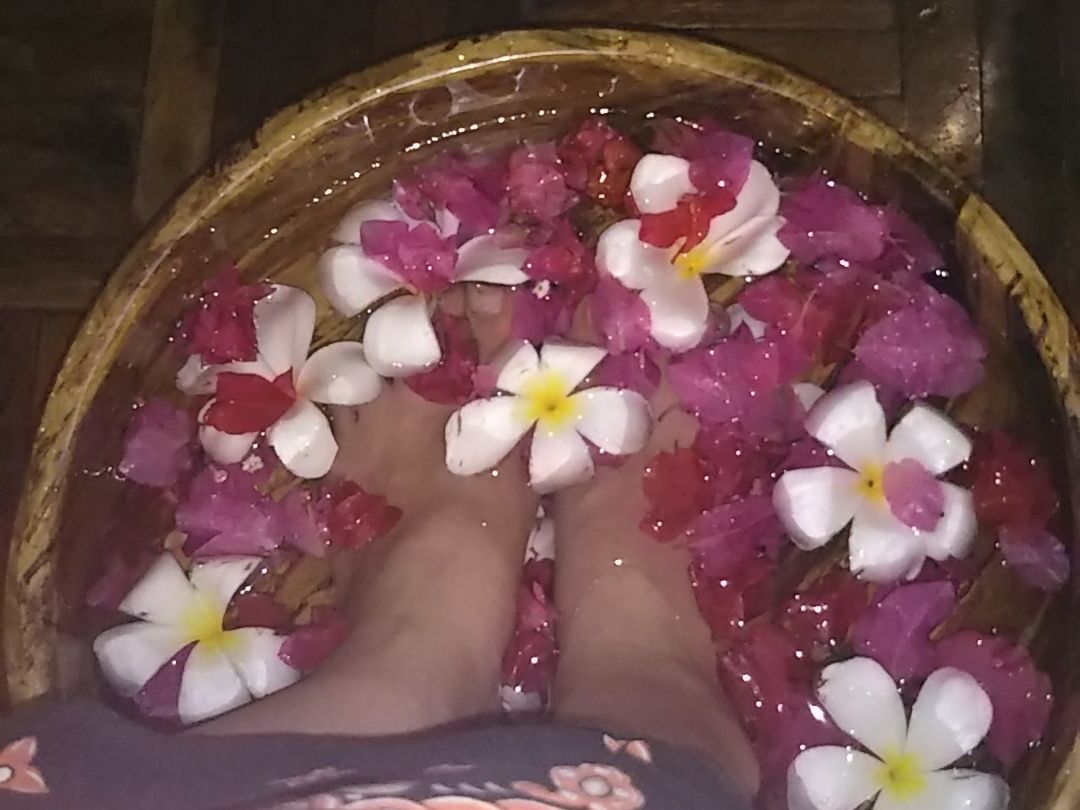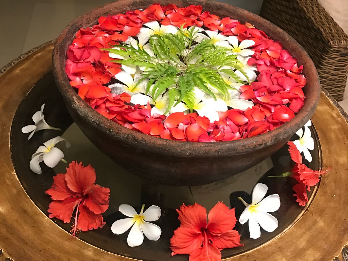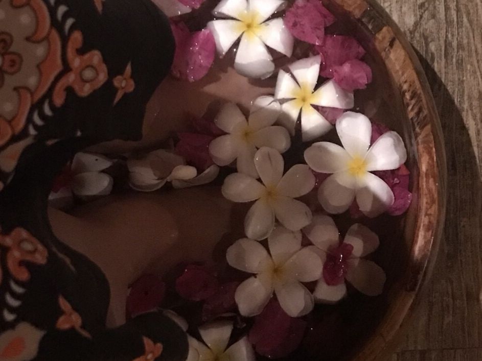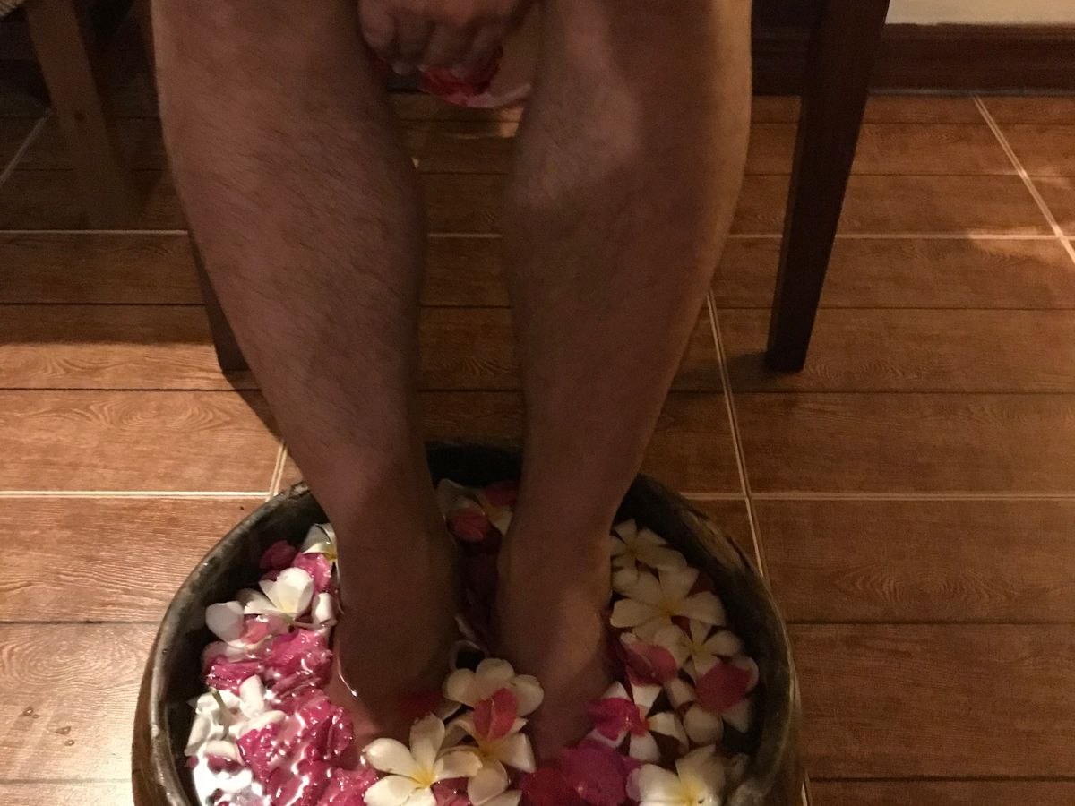 最初、足のマッサージから始まりオイルの香りを6種類?くらいから好きなのを選択できます。(ラベンダー、レモングラス、ローズ、ココナッツetc)その後、うつ伏せになり体全体にあまりいい匂いではないスクラブを塗布されました。大きなバナナの葉?の上に横になるのですが、ベタベタする感じがなんともリラックスできず、あまり居心地が良いものではありませんでした。今まで様々な国でスパを体験してきましたが、ベタベタする状態でバナナの葉の上に横になったり包まれたのは初めてでした。この時、本当に寒くてトイレに行きてくて仕方ありませんでした。10分くらいたった後にタオルの様なものでスクラブを拭き、プリメリアがたくさん浮かんでるお風呂に浸かりながらマンゴーとお茶をいただきました。