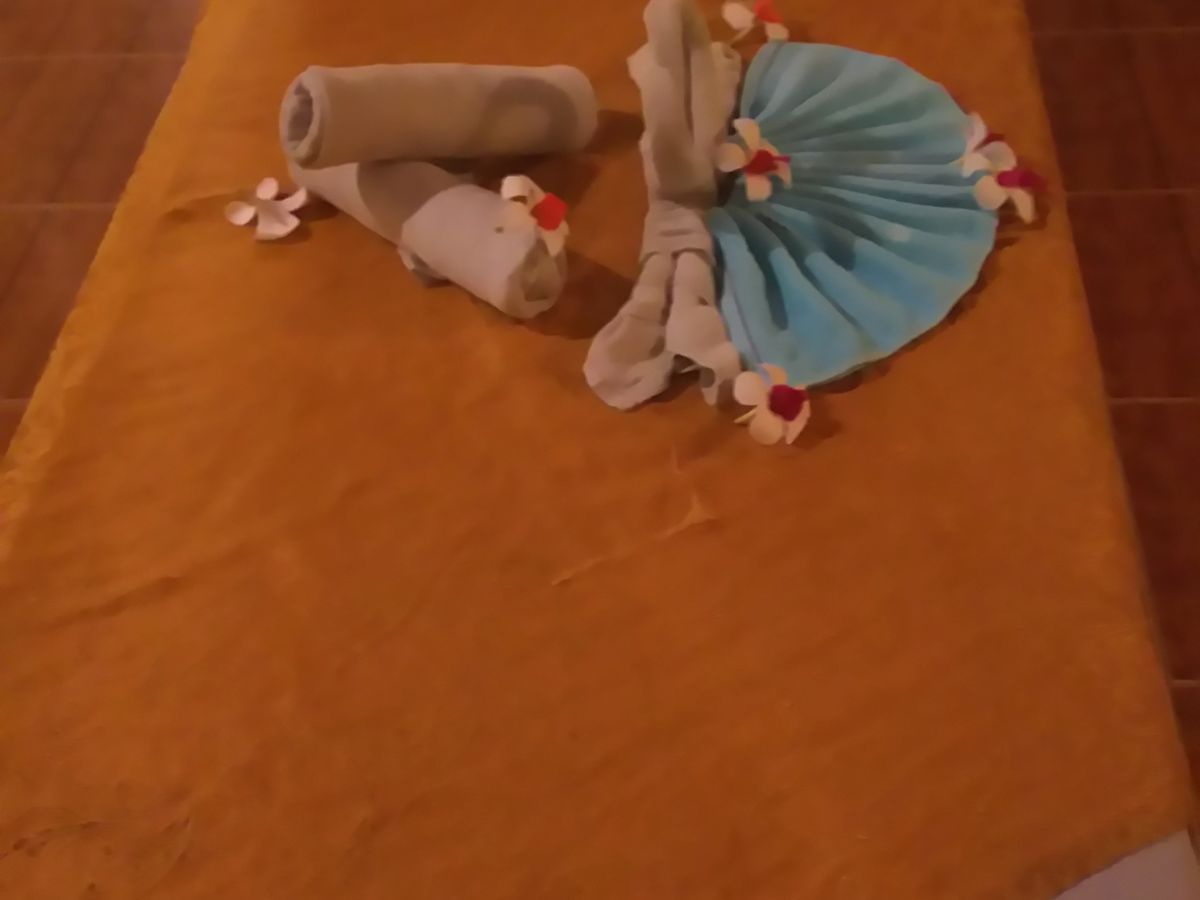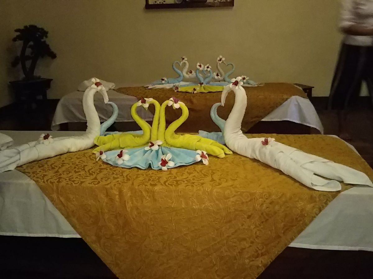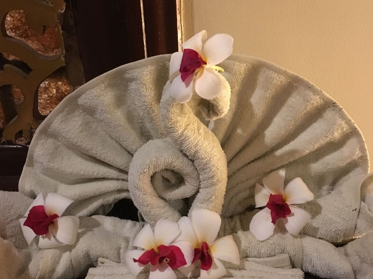 個室に通されますが部屋に入ったらプルメリアと花びらが散りばめられており、タオルで作られていた白鳥がまた可愛い。