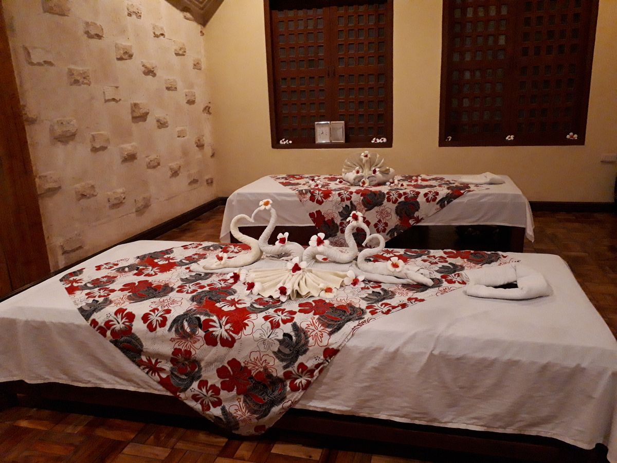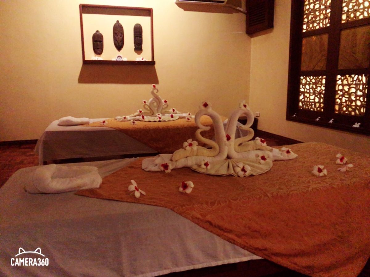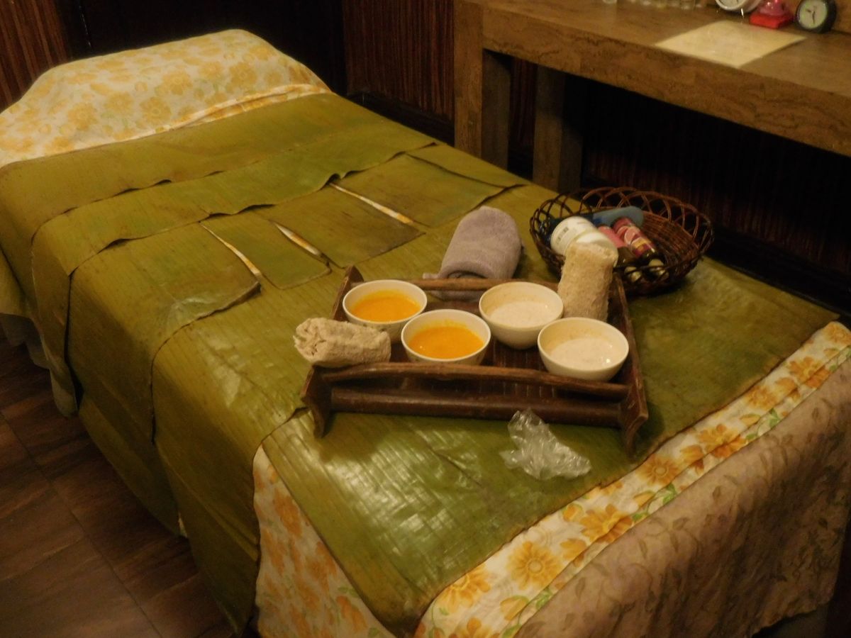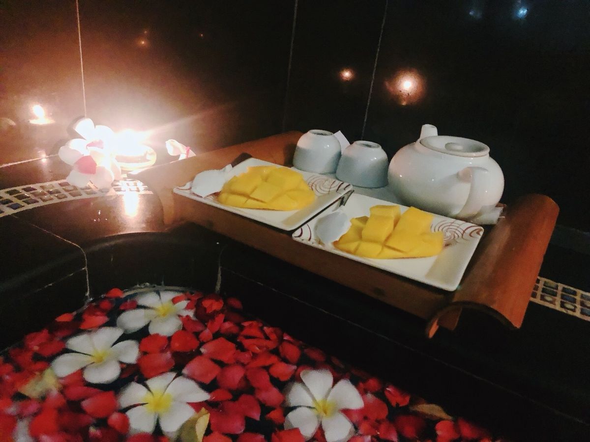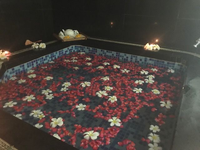 部屋に入った時の印象は「えっこんな感じか…」と少しショックでした。カップルルームでしたが狭い部屋で衛生面も少し不安な気持ちに。ベッドが2台ありビニールの敷かれた少し頼りない簡易ベットにバナナの葉っぱが敷かれてます。まずは柑橘系のフルーツが入った桶につけます。軽石のようなもので角質除去。それぞれ好きな香りを選び、身体のスクラブを行いバナナの葉で全身を巻かれます。ぬるぬるして気持ちが悪いですが我慢。その間にフェイシャルを軽く行って頂きシャワーとお風呂です。2人とも裸になりユニットバス状態のトイレとシャワーの隣接した所で1人ずつシャワーを。そのあとはお花の浮かんだお風呂に浸かります。マンゴーとお茶が用意されてましたが私はお風呂場の衛生面がどうしても気になりマンゴーをそこそこにすぐに上がりました…。