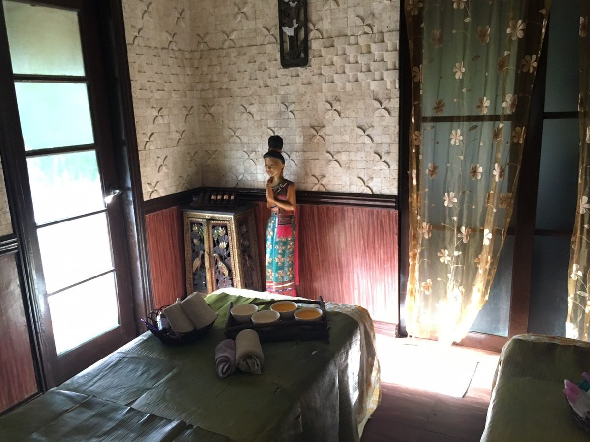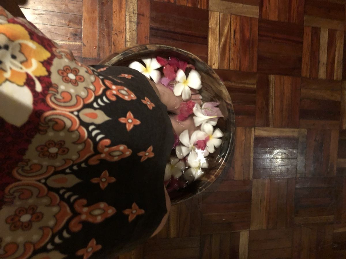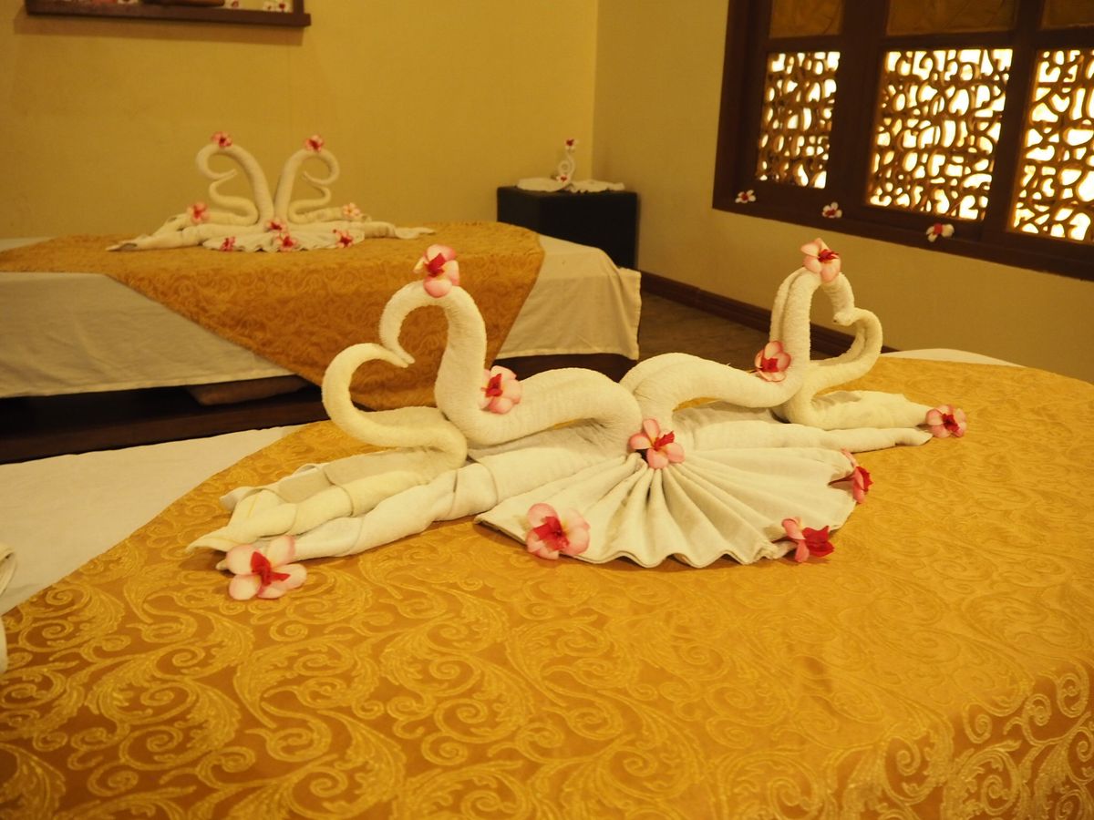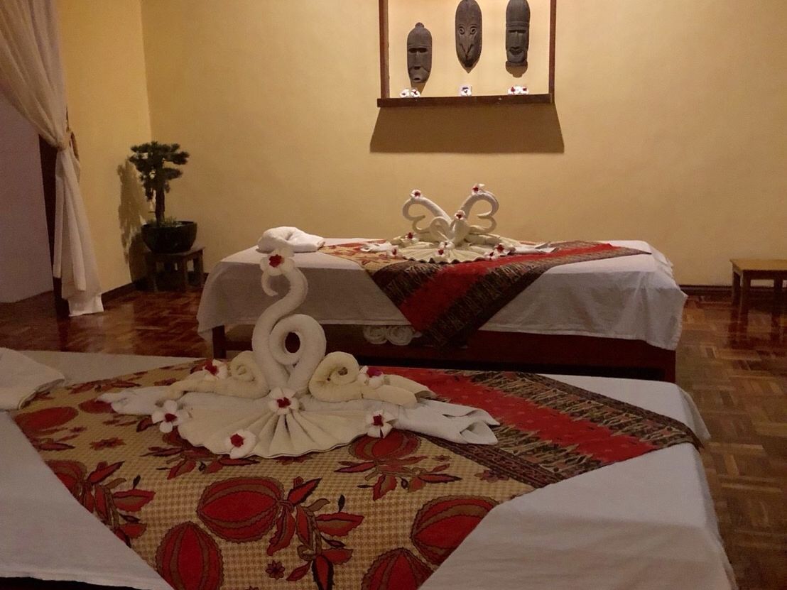 部屋に入った時の印象は「えっこんな感じか…」と少しショックでした。カップルルームでしたが狭い部屋で衛生面も少し不安な気持ちに。ベッドが2台ありビニールの敷かれた少し頼りない簡易ベットにバナナの葉っぱが敷かれてます。まずは柑橘系のフルーツが入った桶につけます。軽石のようなもので角質除去。それぞれ好きな香りを選び、身体のスクラブを行いバナナの葉で全身を巻かれます。ぬるぬるして気持ちが悪いですが我慢。その間にフェイシャルを軽く行って頂きシャワーとお風呂です。2人とも裸になりユニットバス状態のトイレとシャワーの隣接した所で1人ずつシャワーを。そのあとはお花の浮かんだお風呂に浸かります。マンゴーとお茶が用意されてましたが私はお風呂場の衛生面がどうしても気になりマンゴーをそこそこにすぐに上がりました…。