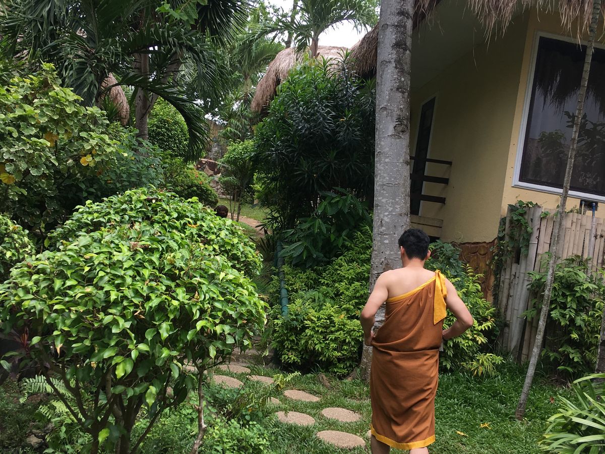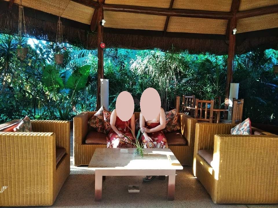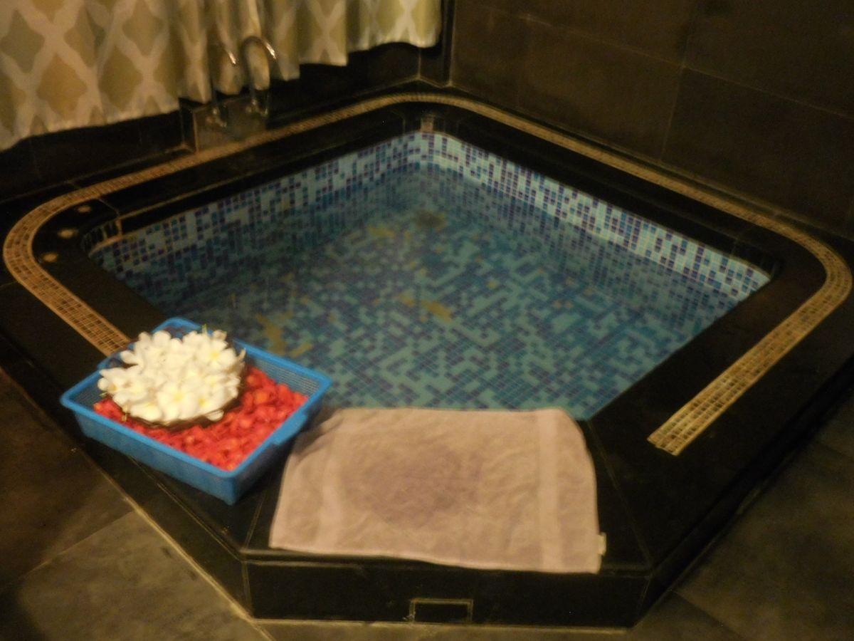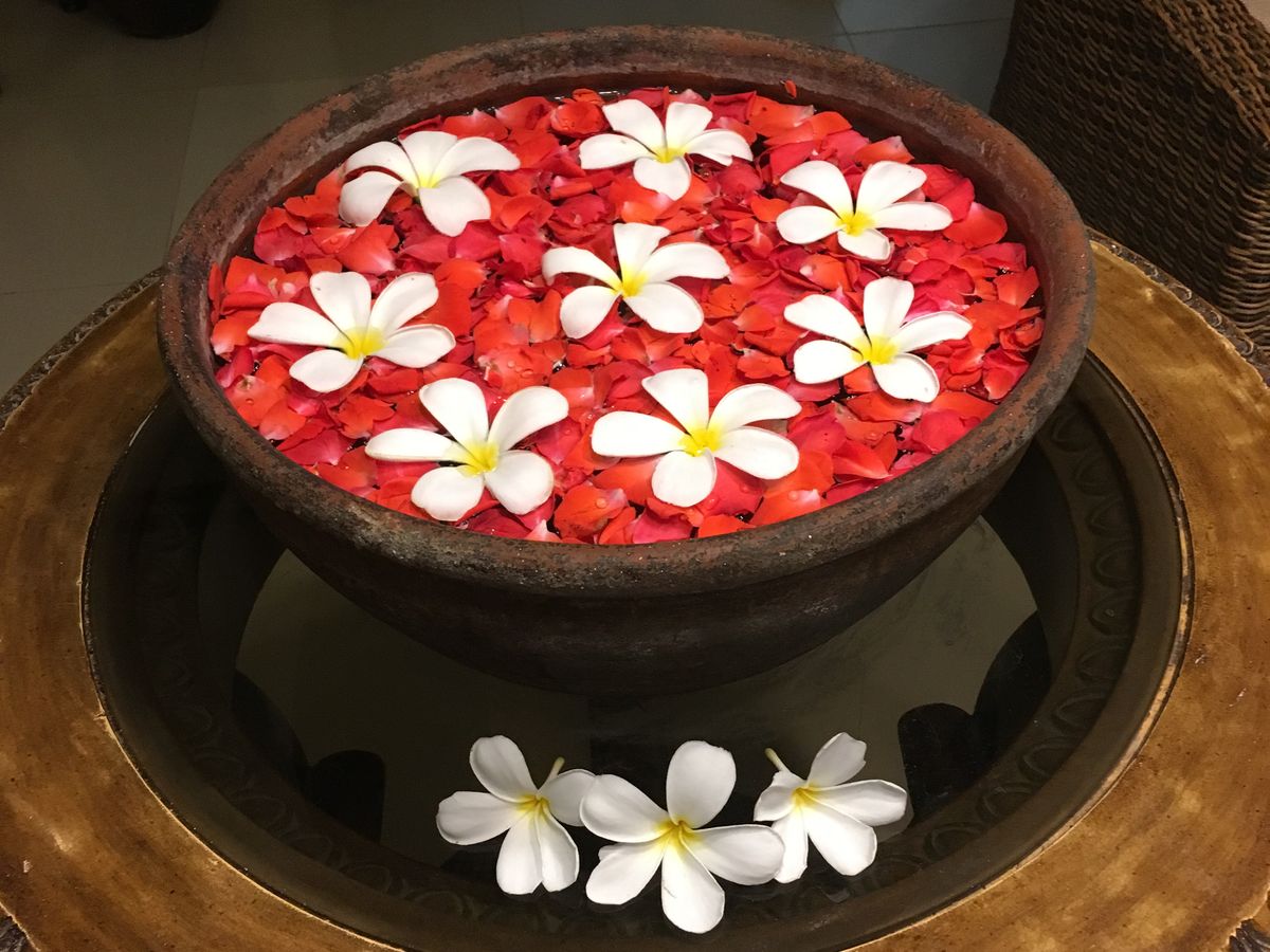 部屋に入った時の印象は「えっこんな感じか…」と少しショックでした。カップルルームでしたが狭い部屋で衛生面も少し不安な気持ちに。ベッドが2台ありビニールの敷かれた少し頼りない簡易ベットにバナナの葉っぱが敷かれてます。まずは柑橘系のフルーツが入った桶につけます。軽石のようなもので角質除去。それぞれ好きな香りを選び、身体のスクラブを行いバナナの葉で全身を巻かれます。ぬるぬるして気持ちが悪いですが我慢。その間にフェイシャルを軽く行って頂きシャワーとお風呂です。2人とも裸になりユニットバス状態のトイレとシャワーの隣接した所で1人ずつシャワーを。そのあとはお花の浮かんだお風呂に浸かります。マンゴーとお茶が用意されてましたが私はお風呂場の衛生面がどうしても気になりマンゴーをそこそこにすぐに上がりました…。
