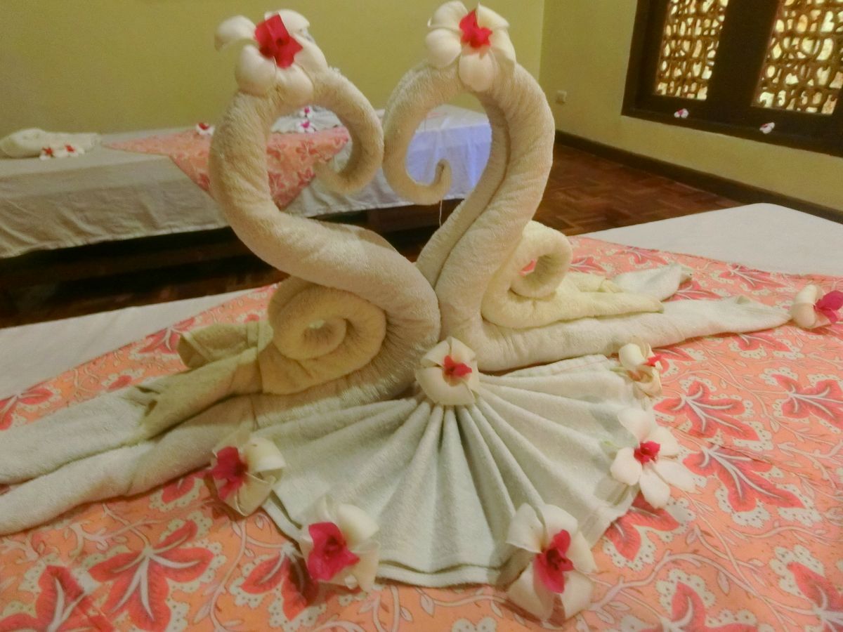 スパのガーデンはきれいに手入れされており、案内していただいた個室へ入ると可愛く折り紙られたタオルの鳥たち!