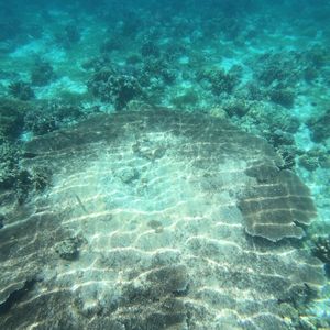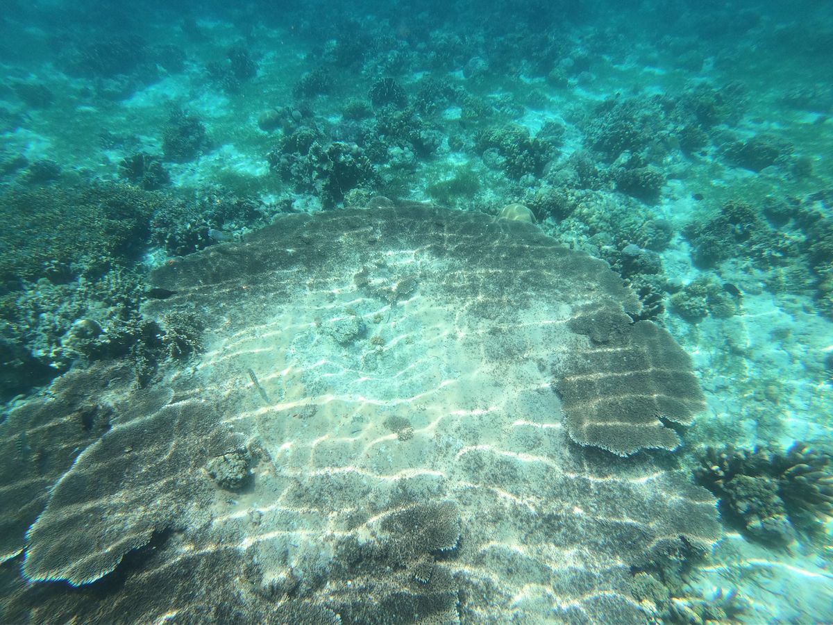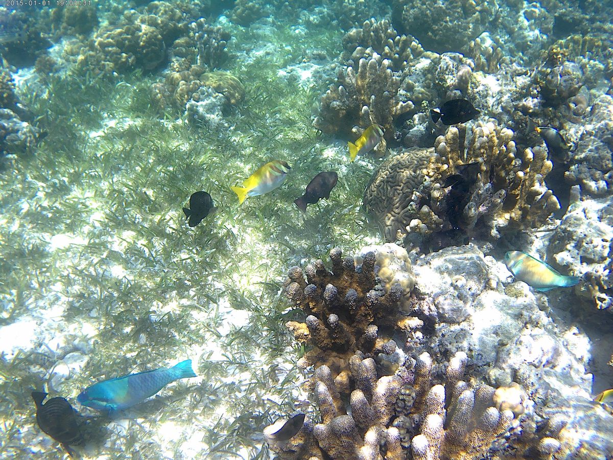 ・シュノーケリング〜事前に説明は受けていましたが、考えているよりもかなりハードでした。船で浅瀬には行けませんので水深6m程の場所で停泊し、その場では特に説明も無く「はい、ここで海に飛び込んで」と指示されます。ライフジャケットあるので、溺れることは無いでしょうが、底の見えない海に飛び込むのは特に女性にとっては勇気いると思いますよ。海に飛び込んだら熟練のガイドさんが持つ引率ボードに捕まって浅瀬を目指して泳いでいきます。浅瀬には行くのですが、それでも水深2mはあるので、足を底に付けることは一切出来ません。これがかなりハードでした。イメージでは浅瀬=足が底に付くだったので、常に海に浮かんでいる必要があります。休むこと無くずっと泳ぎ続けるので、体力が限界に達し、ガイドさんに戻ろうと自ら言いました。言わなければ時間があったのでまだまだ泳いでいたと思います。1時間弱海に浮かび、移動を続けるのは大変でした。魚はたくさん見れましたし、ガイドさんが海底からいろいろとネタになりそうなモノを拾ってきてくれた点は良かったです。