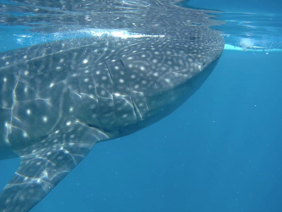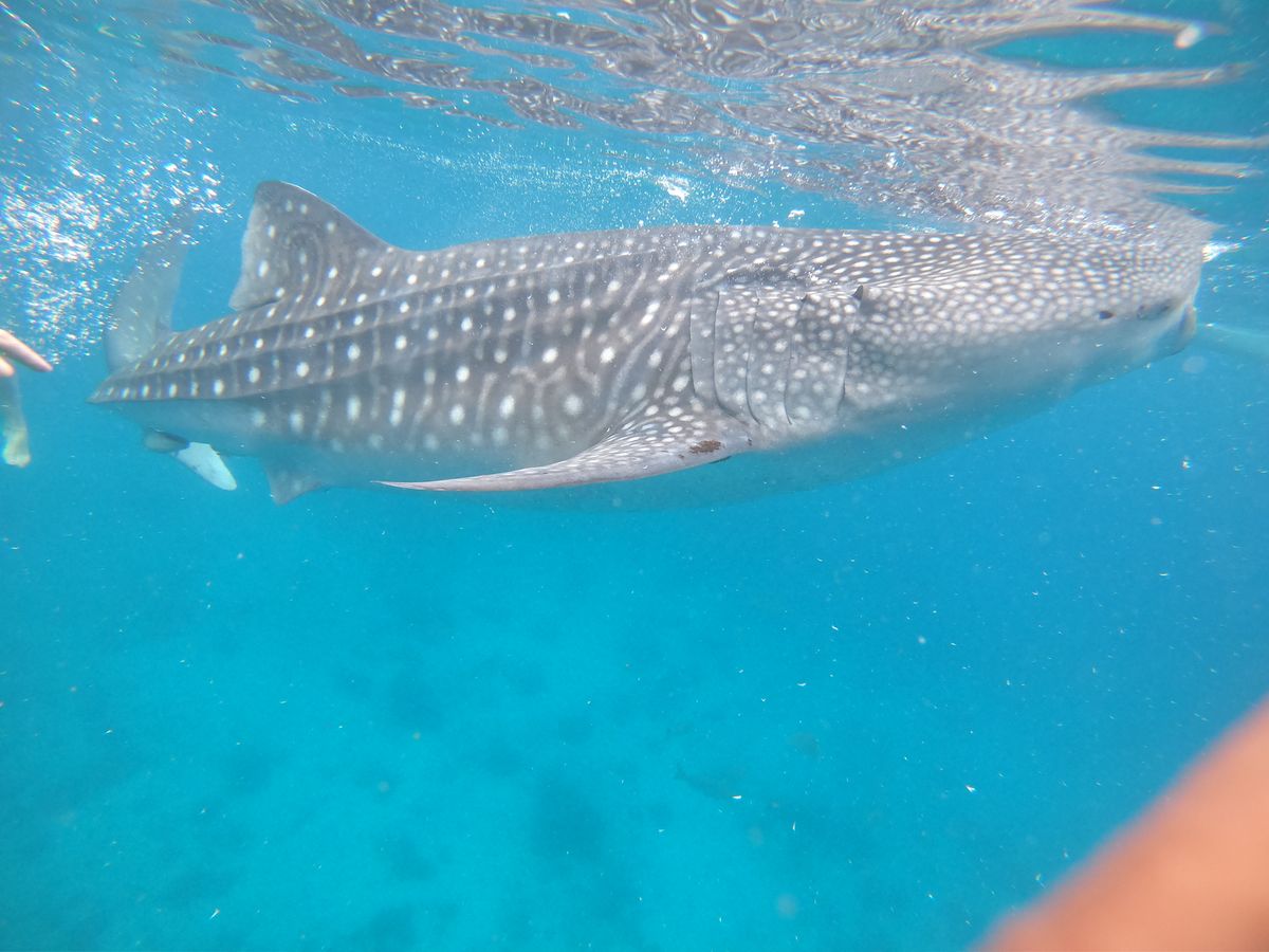 この日はおよそ30分の間に5回ほど一緒に泳ぐことができました。初めて見るジンベイザメは想像以上に大きく、そんな巨漢をゆったりと水中でしならせて泳ぐ姿は案外チャーミングです。そんなジンベイザメにかなり近くまで近づくことができ、感動! なお、私たちが行った時期(12月)はジンベイザメがあまり現れないシーズンらしく、実際に泳いでいたジンベイザメは1匹のみでした。しかし、夏であればもっと多くのジンベイザメが現れるとのことなので、一緒に泳げる機会も多くなるのかもしれませんね。