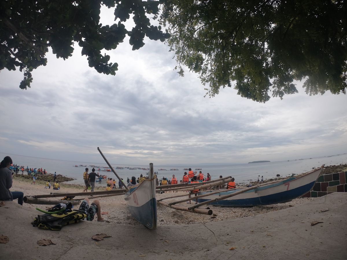 到着後、着替えたら早速ボートに乗ってシュノーケリングスポットまで向かいます。と言っても移動するのは10mくらいでしょうか。現地のスタッフさん3人が漕ぐボートの速いこと。ガイドさんと私たち2人を合わせて計6人も乗っていながら、あっという間に目的地まで到着しました。シュノーケリングスポットでは我々のボートのほかにもう10〜20艘くらいが並んで浮いています。