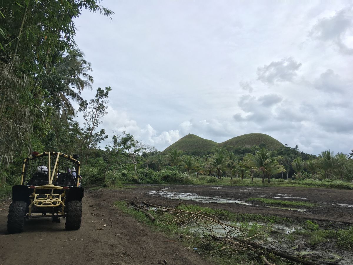 展望台から戻った時、ガイドさんから、「フェリーの時刻まで2時間以上あるが、この待合室で待つかフェリー乗り場で待つかどちらが良いか?」と質問されました。バギーや自転車のアクティビティに連れて行ってくれるものだと思っていたので驚きつつ、なぜこのまま帰るのかと聞いたところ、少し待たされ、渋々連れて行ってくれました。バギーは1人乗り、2人乗りがあり、泥だらけになりますが楽しかったです。泥除けのカッパとビーサンを貸してもらえます。バギーが終わった後はフェリー乗り場に向かいました。フェリー乗り場に着き、チケットを受け取るとすぐにガイドさんはすぐに帰ってしまいました。チョコレート丘についたあたりから早く帰りたそうにしていたのですが流石に酷いなと思いました。フェリー乗り場は水道が故障しているのか水が使えず、トイレが流れません。時間になってもフェリーは来ませんでした。私と友人は英語が話せるので係員の人に話を聞いて状況を把握しましたが、英語ができない方は大変なのではないかな、という状況でした。