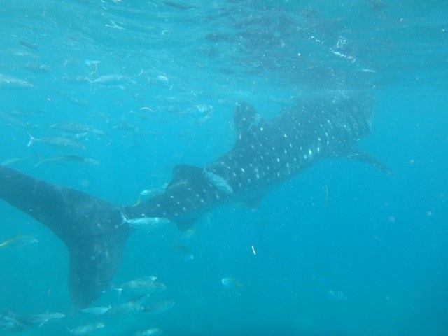 さて、待ちに待ったジンベイザメとのご対面です。ジンベイザメはボートに乗ったおじさんの餌につられて、並んでいるボート群の前を端から端に泳いできます。ジンベイザメが向かってきたら私たちも泳いで近づき、スタッフに託したカメラで写真を撮ってもらうというのが一連の流れです。当然ですが、ジンベイザメに触れてはいけません。それと注意事項関連としてもうひとつ。海を汚さないための配慮でしょうか、日焼け止めクリームを塗るのが禁止されています。直射日光は避けられないため、日焼けを気にする方は水着の選択が重要になってきます。