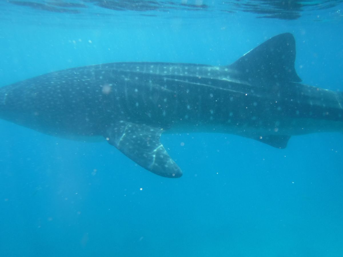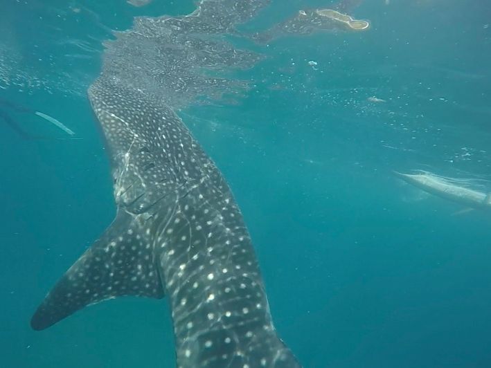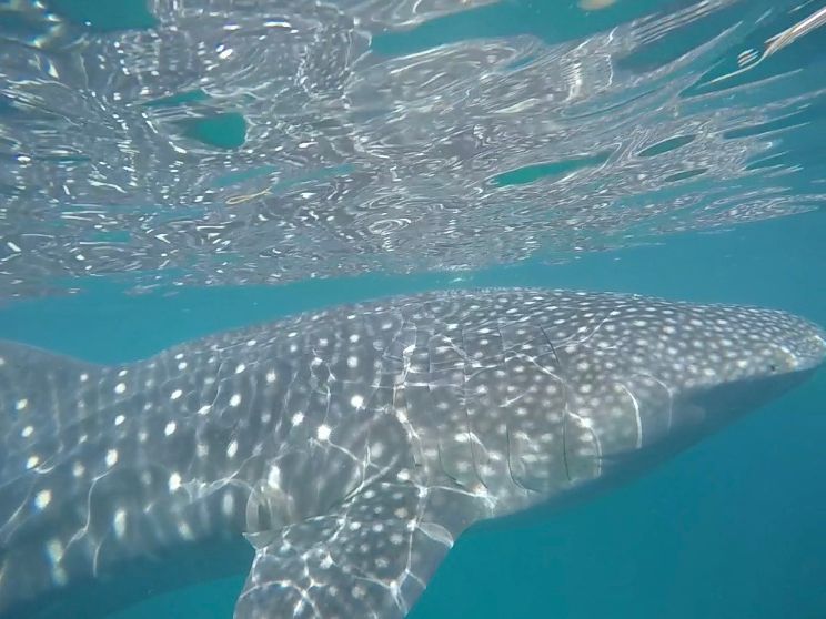 ●浜辺からボートに乗り込み50mほど沖合のジンベイザメゾーンへ。ボートを固定して、その周辺でジンベイザメの周遊を待つというスタイルでした。気づいたらすぐ足元にジンベイザメがいたりして、興奮しました。何匹もいたようで、終始ジンベイザメを見続けることができ大変満足でした。